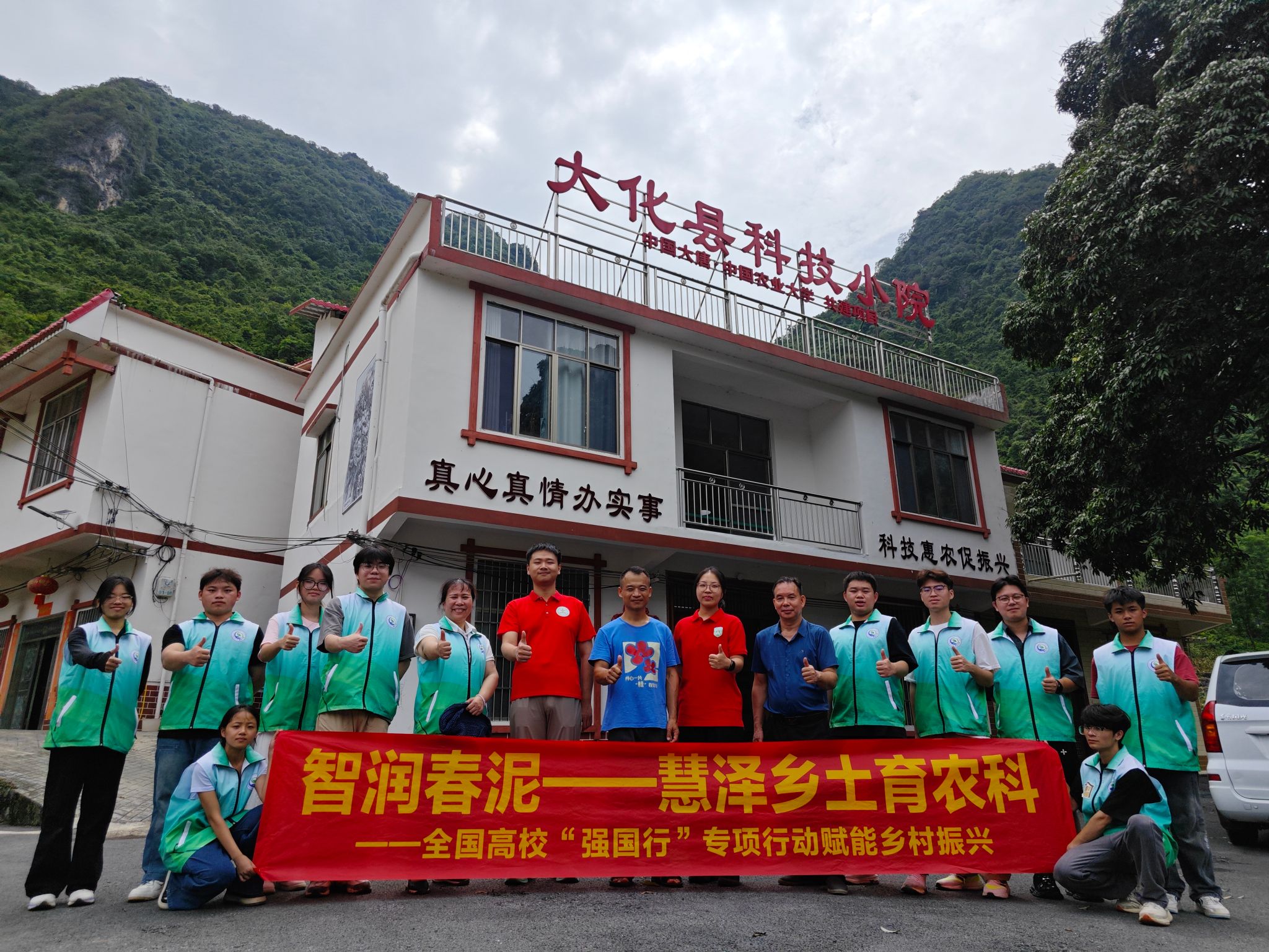 团队专程拜访了中国农业大学驻丹桂村的“大化县科技小院”。驻院的两位农学博士热情接待师生参观试验科普陈列区。《智润春泥》创新小分队与广西多得乐生物科技有限公司联合研发了复合微生物秸秆腐熟菌剂和果多宝有机水溶肥料,现场赠送给科技小院实验组及丹桂村农业合作社。