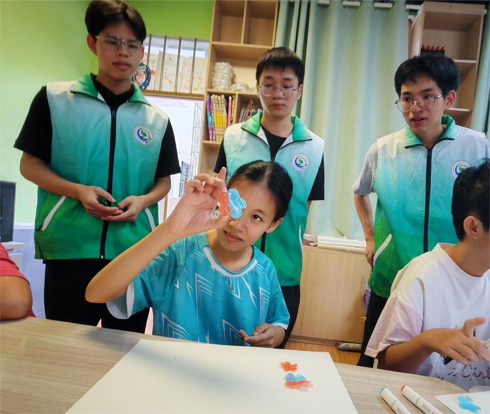 项目负责蓝天立同学(残疾大学生)为大家讲解并演示塑锦艺品的制作过程,团队成员准备了多种DIY工具,协助孩子们挑选自己喜爱的颜色,为花瓣上色、塑形、粘贴。
