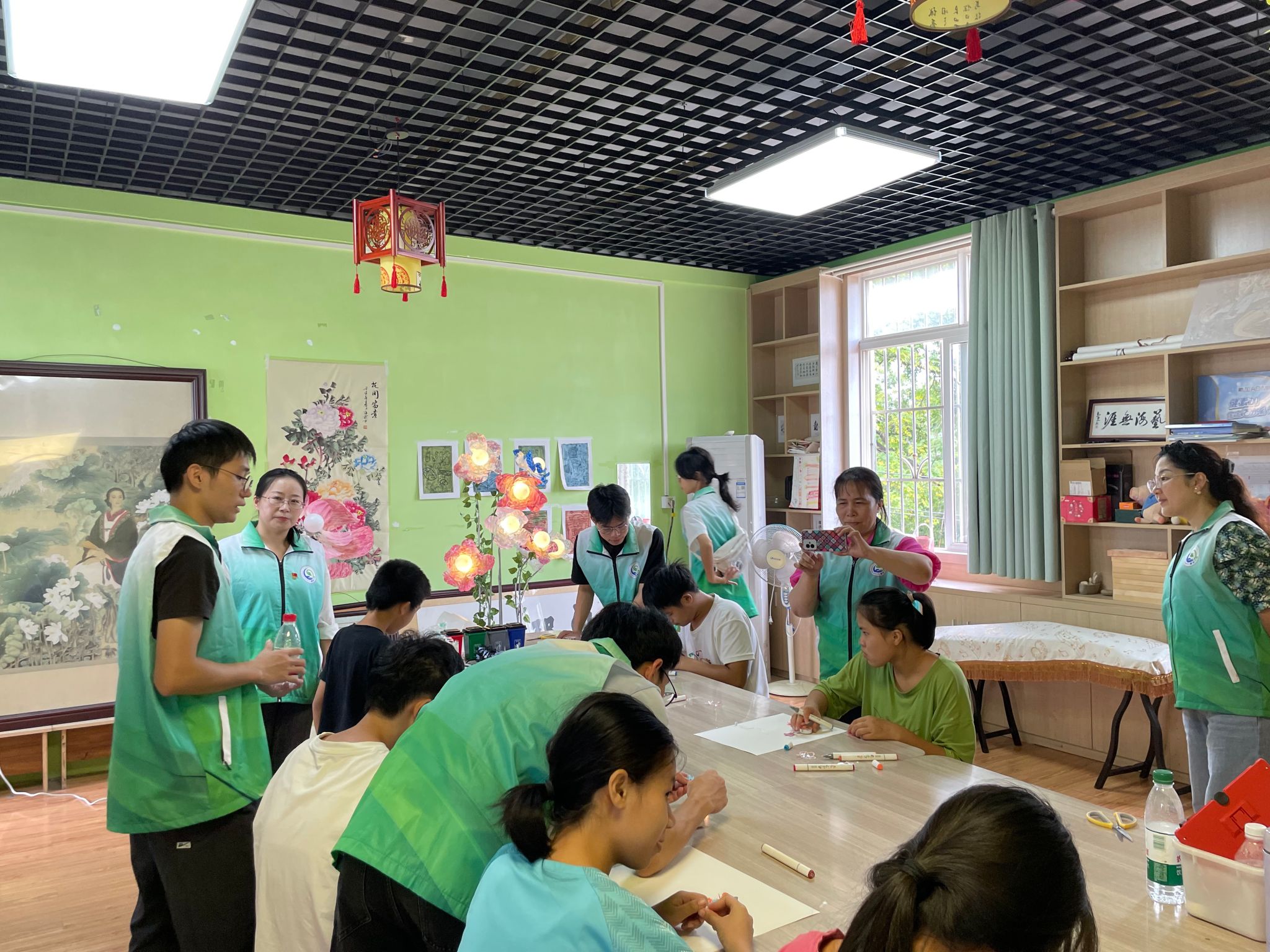南宁市武鸣区特殊教育学校书记、校长黄成强,副校长杨美金热情接待并引导师生们来到特殊兴趣书画课堂,正在上课的残障孩子们一看到团队带来的用废弃塑料瓶制作的再生多彩花灯艺品就发出了热烈的欢呼声和惊叹声,节水节能行动协会指导老师吴萍介绍了垃圾分类、塑料污染的危害及其转化价值,组织孩子们参加垃圾分类小游戏和用画笔描绘多彩花灯的美丽图形。