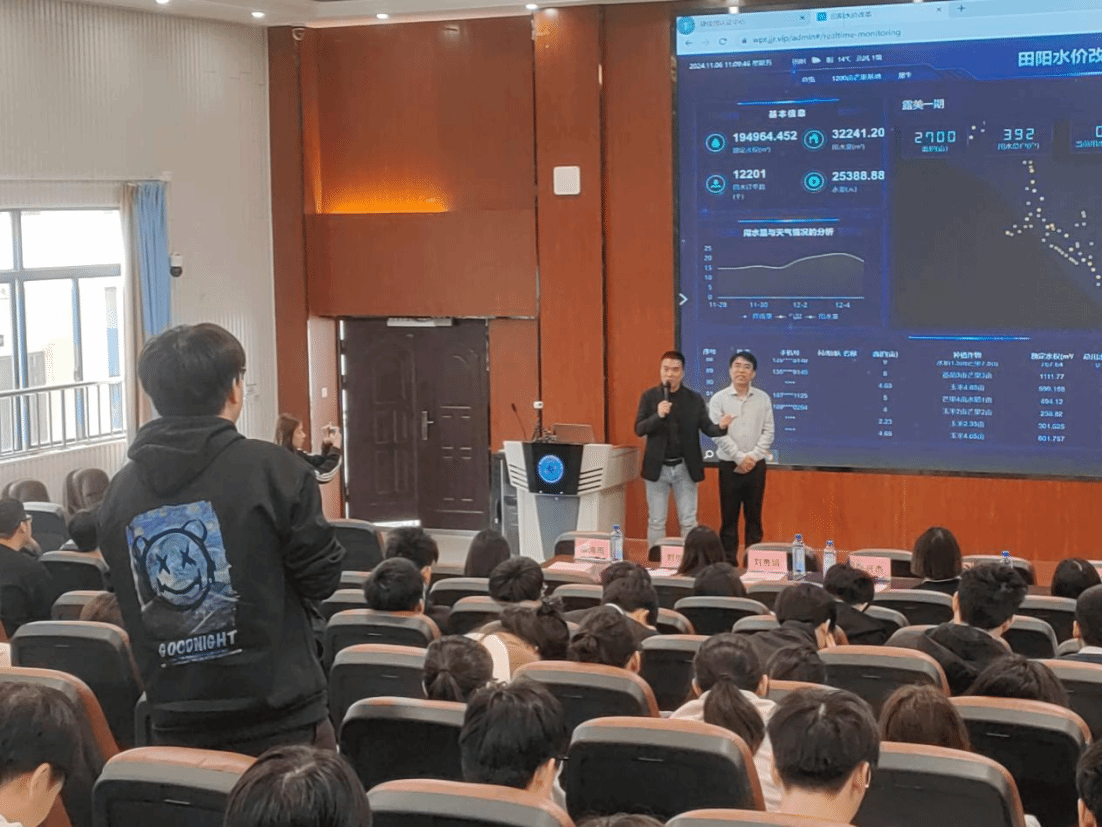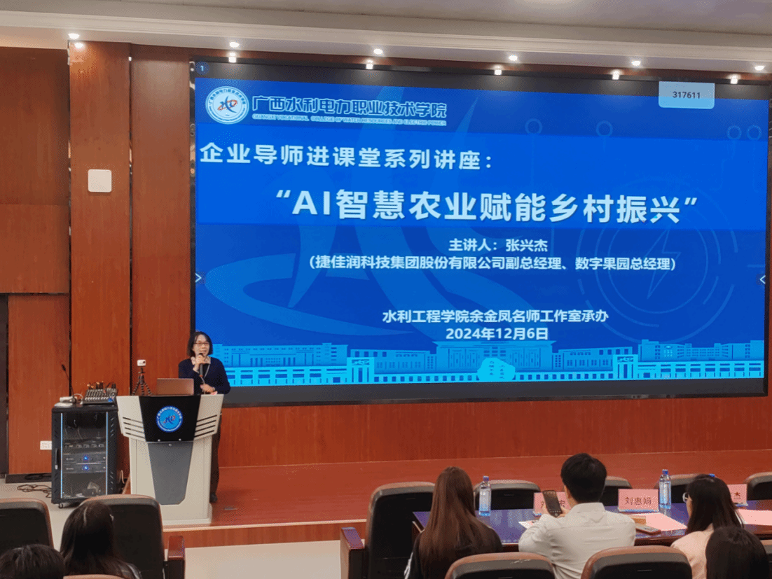 讲座伊始,捷佳润科技集团股份有限公司副总经理、数字果园总经理张兴杰围绕土谛AI引导学生亲身感受GPT技术+智慧农业的最新动态。随后详细介绍公司在数字农业、智能水肥一体化、高标准农田的解决方案和实践成果。他还分享了依托捷佳润数字农业打造新型乡村的案例,包括尼日利亚吉加瓦州甘蔗基地、蒙山乡村振兴蔬菜温室大棚及百色田阳区农业水价综合改革等国内外项目案例,并现场演示了捷佳润智慧农业云平台。在互动环节中,学生们积极提问,张兴杰耐心解答了学生们的疑惑。