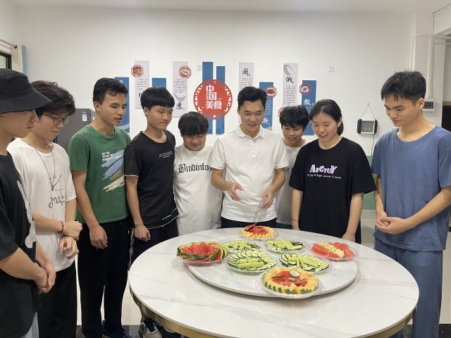 活动过程中准备了丰富的食材活动分为菜系佳肴大比拼”“水果大拼盘”两个内容,活动开始,各小组同学根据比赛规则,大显身手,精湛的刀工、娴熟的技艺,精心的装饰,赋予寻常食材非凡的魅力。活动结束,老师总结,希望同学们在学习之余,积极参加实践活动,鼓励同学们在实践中做好国家资助政策的宣传者、励志典型的示范者、感恩知恩的实践者。