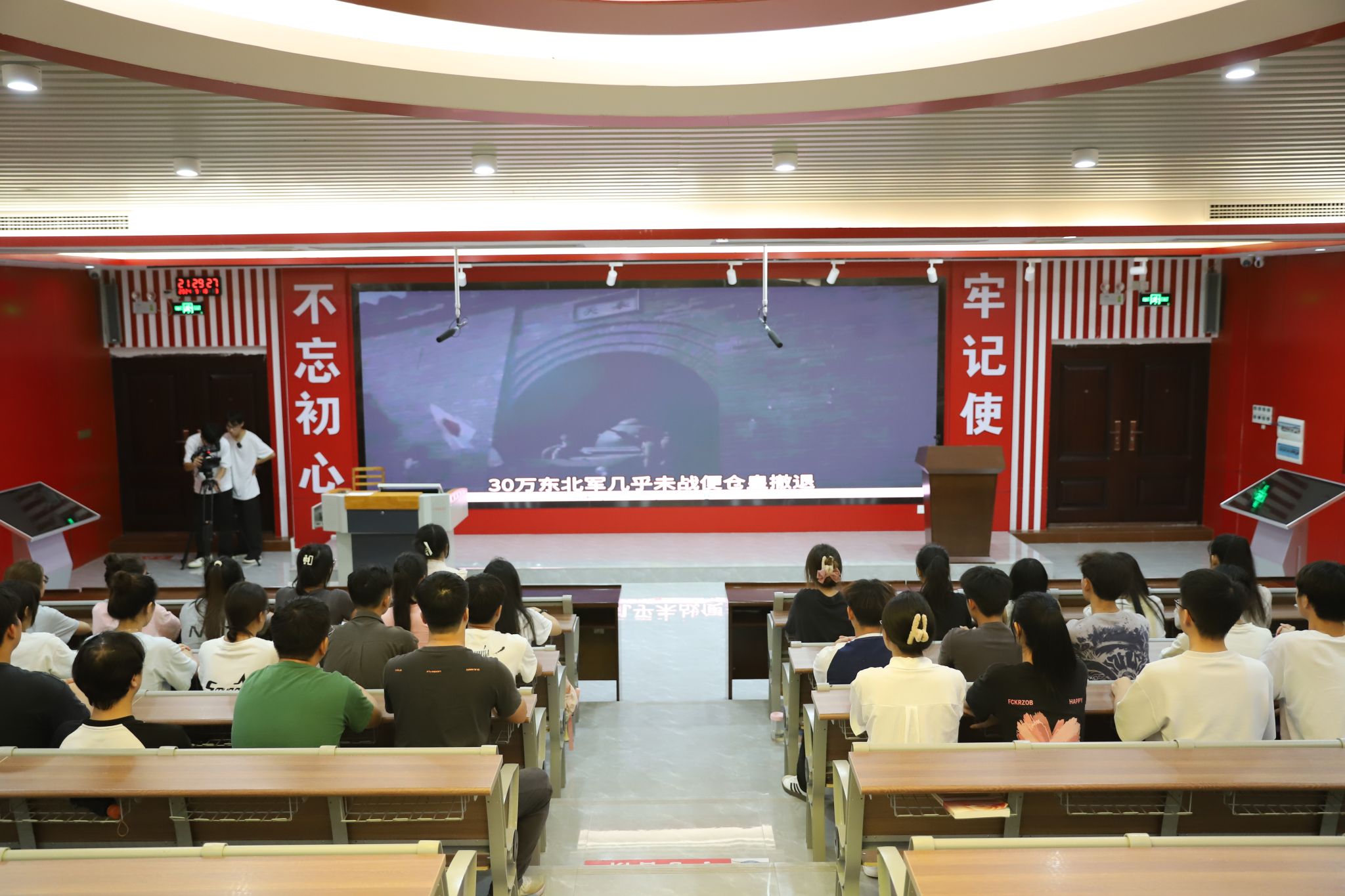 活动伊始,苏健老师向在场的全体师生深刻剖析了“九一八”事变的历史渊源及其对中国民族产生的深远影响,一同回顾了那段屈辱与抗争交织的岁月。随后,全场师生肃立,共同默哀一分钟,以此表达对在“九一八”事变中牺牲的同胞及抗战英烈的无限哀思与崇高敬意。紧接着,全体师生观看了一部精心挑选的爱国主义题材影片。影片不仅唤醒了大家内心深处对民族命运的共鸣,更激发了强烈的民族自豪感和爱国热情,触动了在场每一个人的心弦。