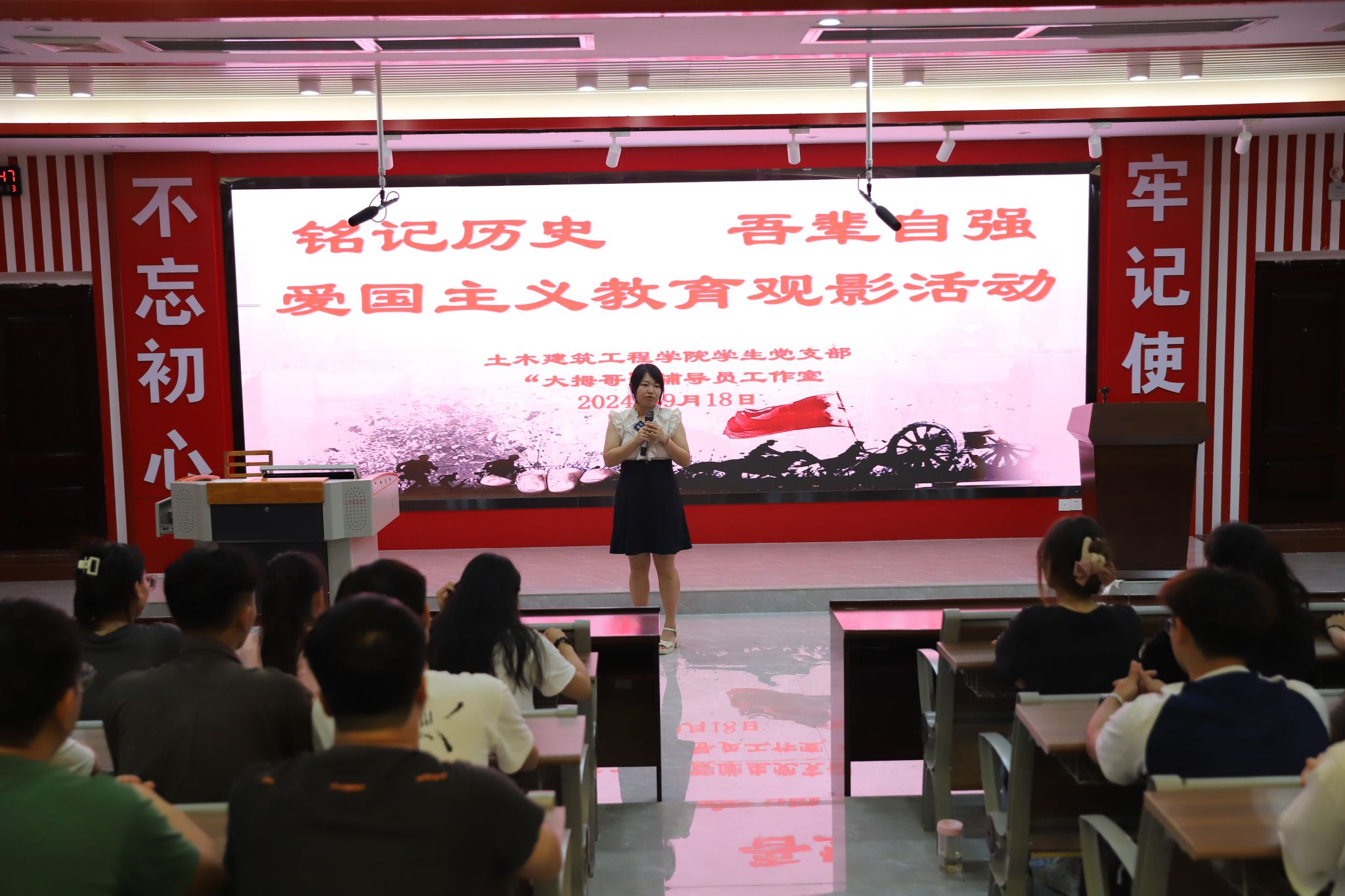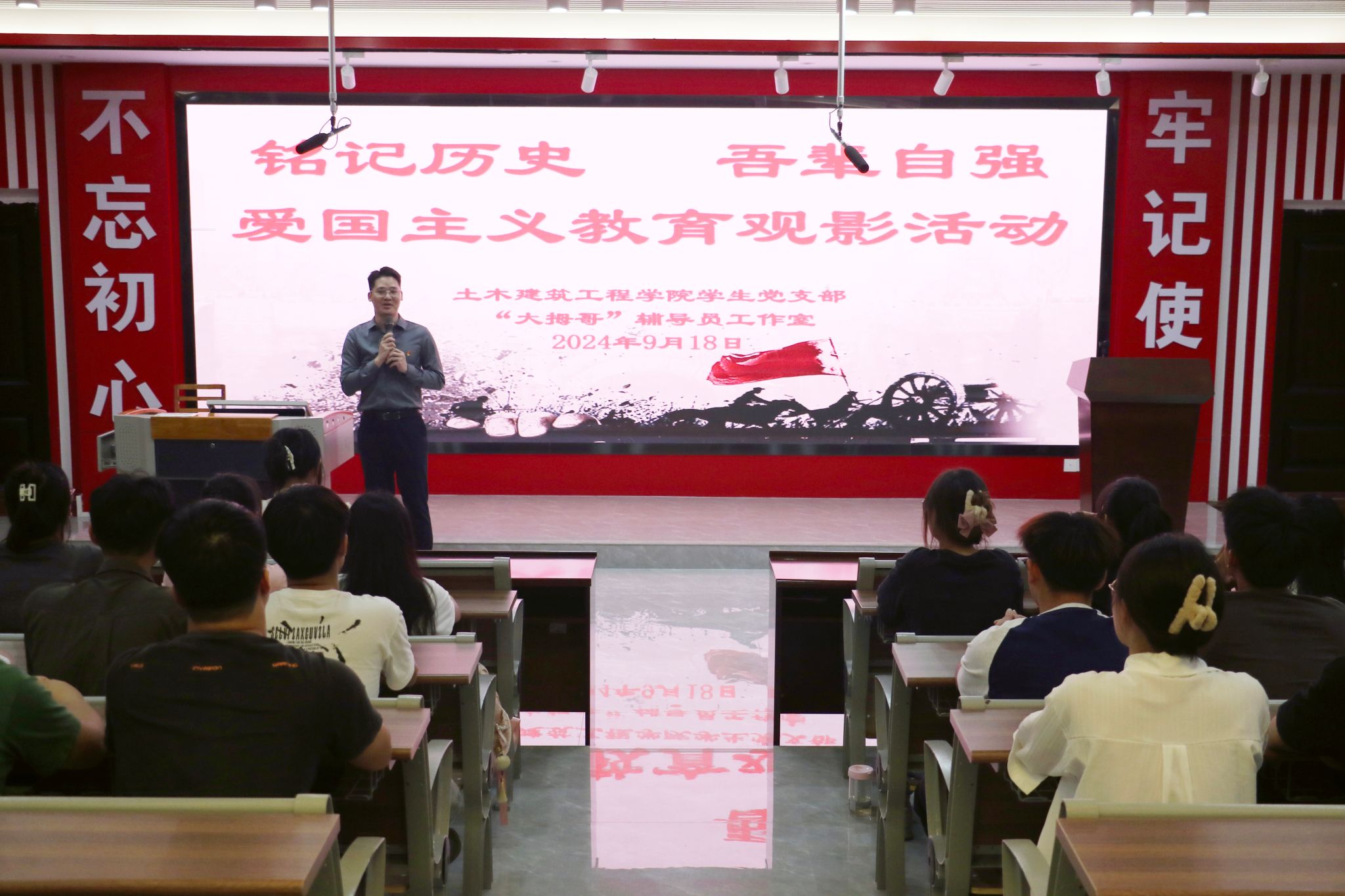[本网讯]为纪念“九一八”事变,弘扬爱国主义精神,9月18日,土木建筑工程学院学生党支部联合“大拇哥”辅导员工作室在里建校区第一教学楼阶梯教室301开展了以“铭记历史 吾辈自强”为主题的爱国主义教育观影活动。学院院长助理彭聪、学院团委副书记梁春艳、学生党支部组织委员苏健及50名入党积极分子参加活动。