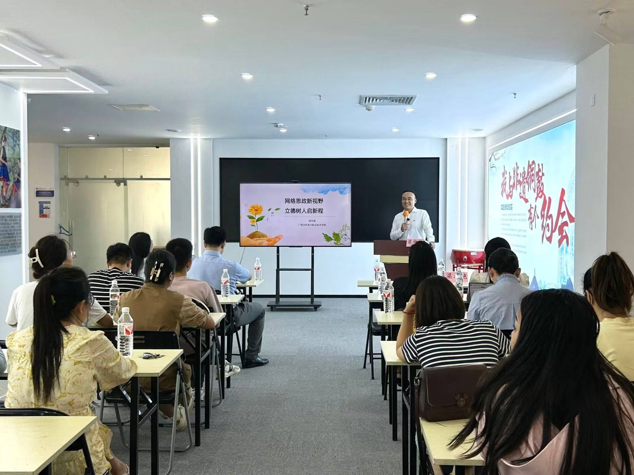 活动伊始,黄恒拾热情接待并陪同参观自治区示范性民族文化传承创新职业教育基地,分别介绍了基地的发展历程、建设情况,大家共同参观展示厅内陈列的一件件独具匠心的学生文创作品。随后,梁中超以《启智润心,虚实共振,做学生成长成才引路人》为题进行分享。他深入剖析了当下网络思政工作的形势、任务和发展趋势,并结合自身18年的高校工作经历分享了新时代网络思政育人的心得体会。他强调,以大学生喜闻乐见、乐于接受的方式开展思政工作,让网络思想政治教育从“指尖”到“心间”,为大家提供了丰富而宝贵的经验。