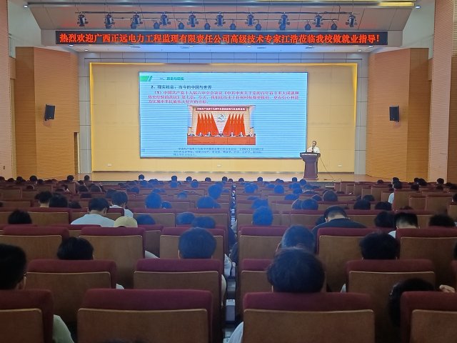 [本网讯]为认真落实学习贯彻习近平新时代中国特色社会主义思想主题教育精神推动学生就业工作高质量发展,帮助学生适应就业形势,树立正确的就业观和择业观,提升就业能力,5月12日,土木建筑工程学院在里建校区青年之家报告厅开展就业指导讲座。本次讲座邀请到了广西正远电力工程建设监理有限责任公司高级技术专家江浩作为主讲。