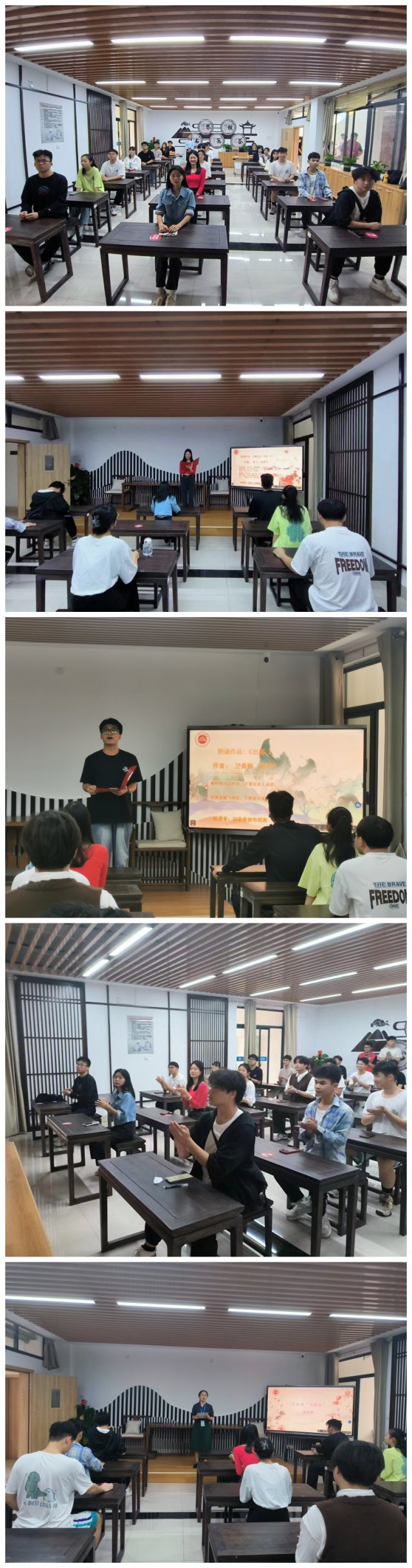 活动分为三个环节。首先,在古诗词朗诵环节,每位同学选择一首能启发心智、鼓舞人心的古诗词,依次上台以正念朗读的形式诠释作品。“达则兼济天下,穷则独善其身”道出了中国文化精髓中“儒道互补”的思想境界;《将进酒》中“天生我材必有用,千金散尽还复来”写出诗人李白屡遭挫折后不计得失、豁达乐观的心态。同学们通过朗诵古诗词,觉察当下的内心感受,抒发自己的不良情绪。此外,在朗读环节中间还穿插古诗词“飞花令”环节,现场参与者听到“飞花令”快速进行抢答,现场气氛热烈。同学们在诗词较量中感受传统文化的魅力,进一步提升人文素养。最后,在古诗词交流环节,同学们各抒己见,纷纷表示在活动中接受中华传统文化的熏陶,感受古诗词带来的心灵力量,今后将继续发扬传统优秀文化,以古诗词中蕴含的人生哲理开导心灵。