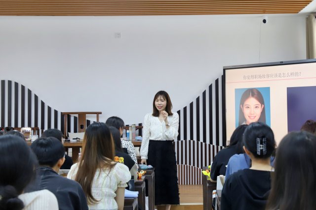林萍老师依次对化妆的特点、作用、基本的化妆用品与基础化妆步骤等知识进行了普及,并重点对妆容类别中的职场妆容进行了介绍,使同学们对职场妆容有一个正确的认知,为同学们今后步入职场打下基础。