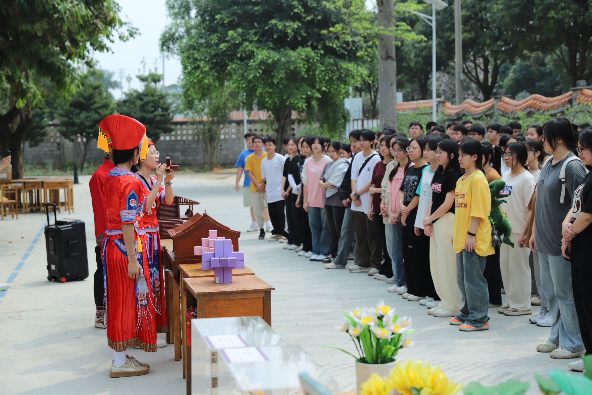 活动现场内容丰富,华侨中学的师生们积极地参与到活动中来。土木建筑工程学院团委书记莫潇娉带领水电学子为华侨中学带去了木构建筑宣讲、非遗扎染手工技艺体验、非遗醒狮挂件制作、非遗手工艺品展示等活动内容。在木构建筑宣讲环节,同学们惊叹木构建筑的榫卯技艺,纷纷聚集在模型周围观看拆解、拼接过程。在非遗扎染环节,同学们亲手参与制作扎染服饰。在非遗醒狮挂件制作环节,同学们被精美的非遗醒狮挂件吸引,工作人员将同学们两两分为一组,并指导他们制作挂件。在非遗手工艺品展示环节,同学们认真了解民族工艺品魅力的同时,还参与现场工作人员组织的民俗百科知识小问答,赢得精美小礼物。