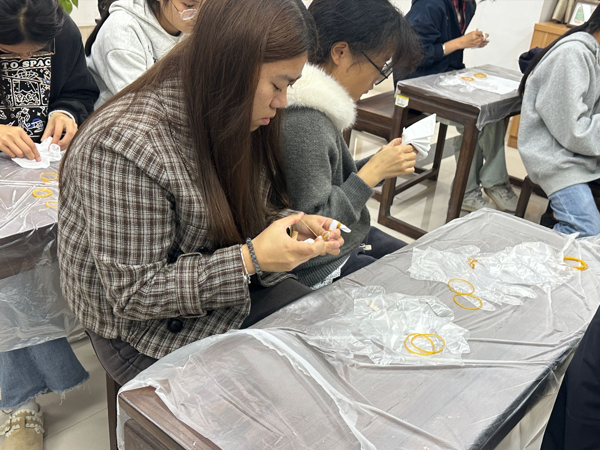 为引导学生在亲身实践中感知非物质文化遗产的独特魅力,深化对中华优秀传统文化的认同与自信,12月12日下午,鲁班建筑技术服务队于里建校区“一站式”学生社区传统文化馆,举办以“染韵非遗,布语匠心”为主题的非遗扎染实践体验活动,共有25名学生参加了本次活动。