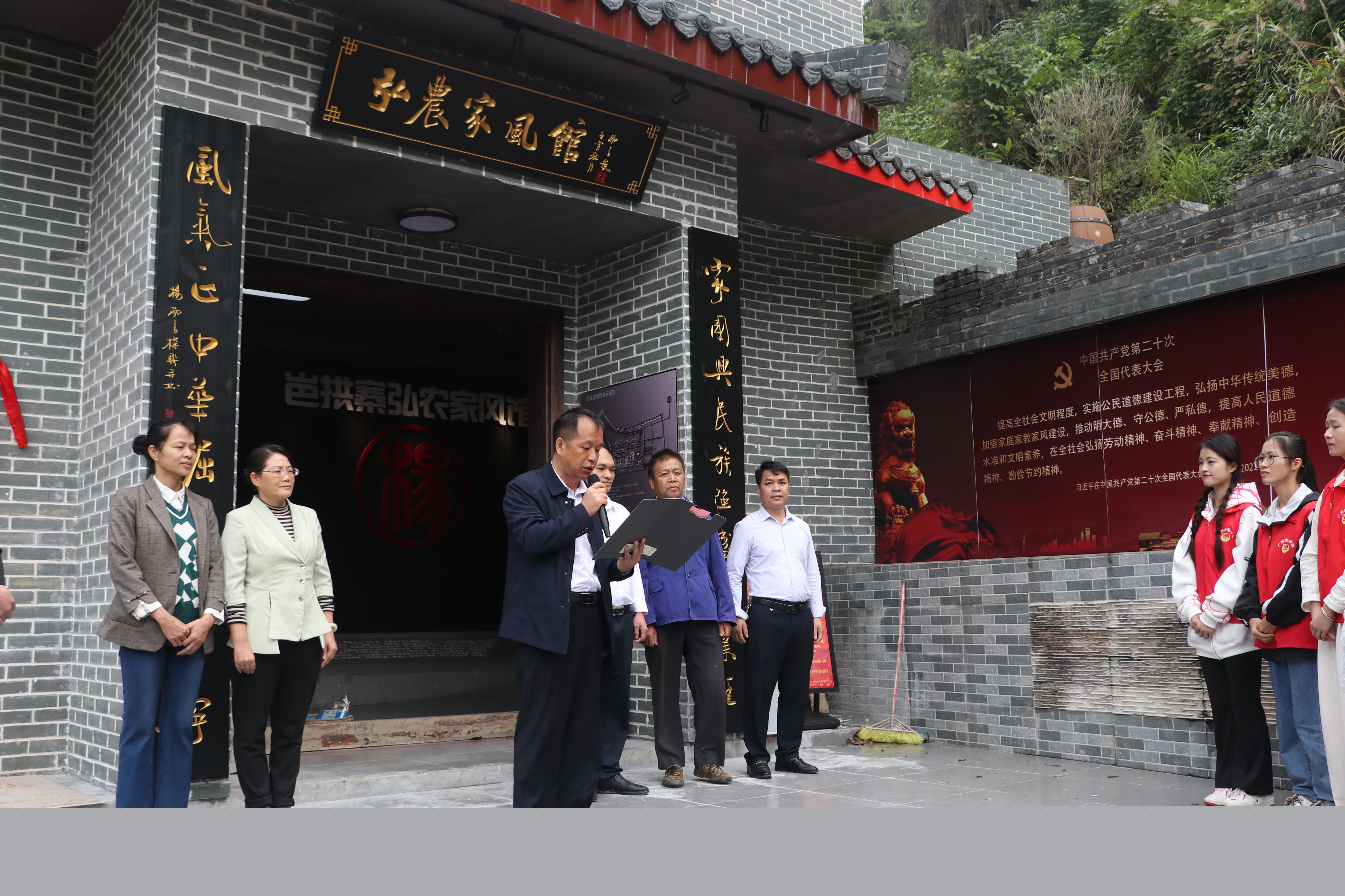 [本网讯]为深入贯彻落实习近平总书记在全国教育大会上的重要讲话精神,努力构建德智体美劳全面培养的教育体系,2023年11月8日上午,学院党委副书记侯宗毅、通识教育学院院长韦弘、校团委书记石春丽、九圩镇人大主席韦锦新、九圩镇党委副书记韦志鹏、副镇长蓝鹏真、学校九圩镇驻村第一书记和部分师生代表共50人到河池金城江区九圩镇岜拱村弘农家风馆开展劳动教育、美育教育实践基地挂牌仪式。