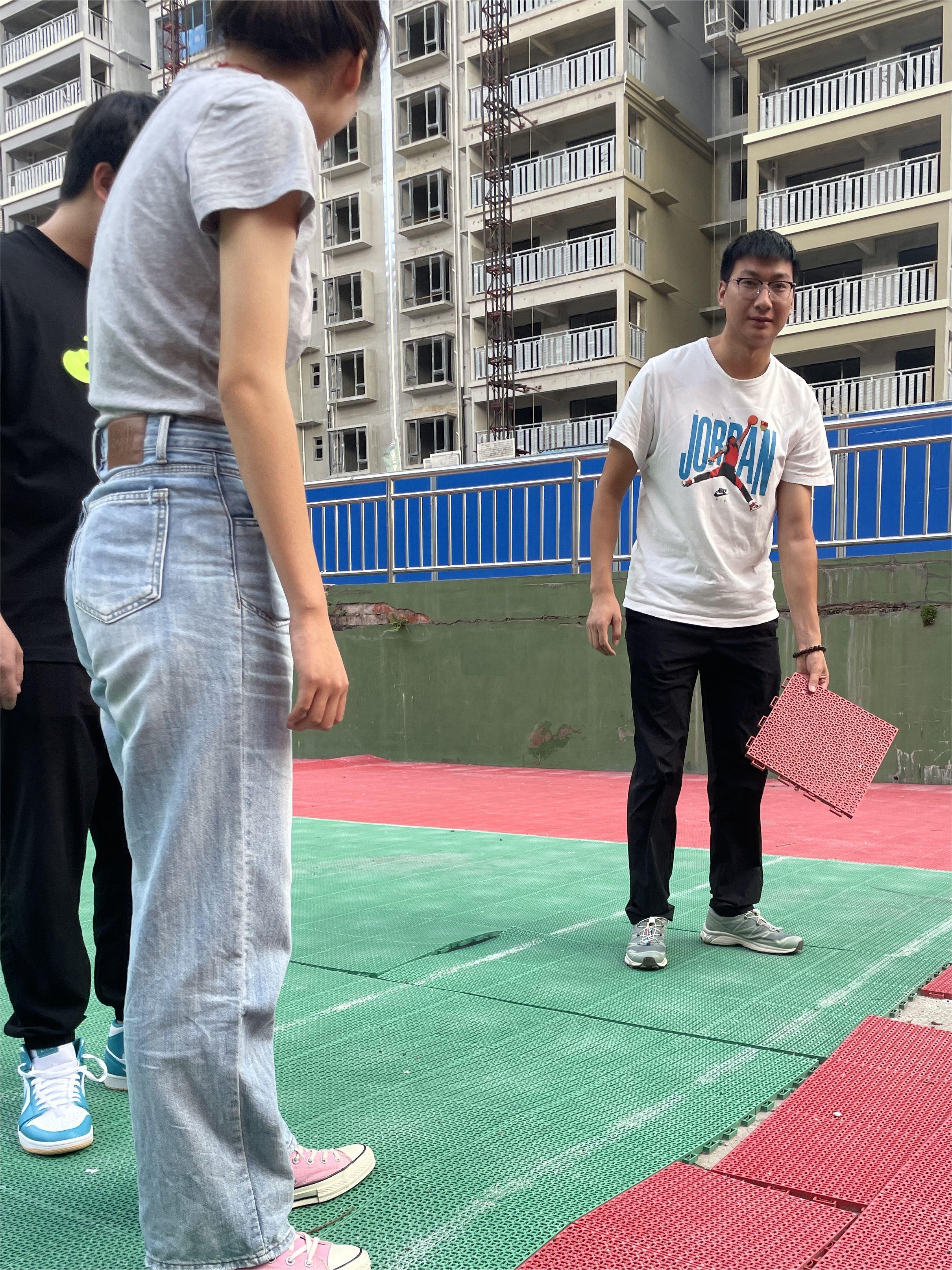 开学在即,支部体育教学团队党员同志在学生返校前对长堽校区运动场地和器材进行安全检查。检查过程中发现篮球训练场由于暑期大雨浸泡,出现地板开裂、地垫拱起等情况,这会影响正常的教学活动,并存在一定的安全隐患。针对裂缝和拱起部分,党员同志仔细检查,替换了旧地垫,对裂开部分重新拼接和维护,并将场地周围的树叶与垃圾清理干净。