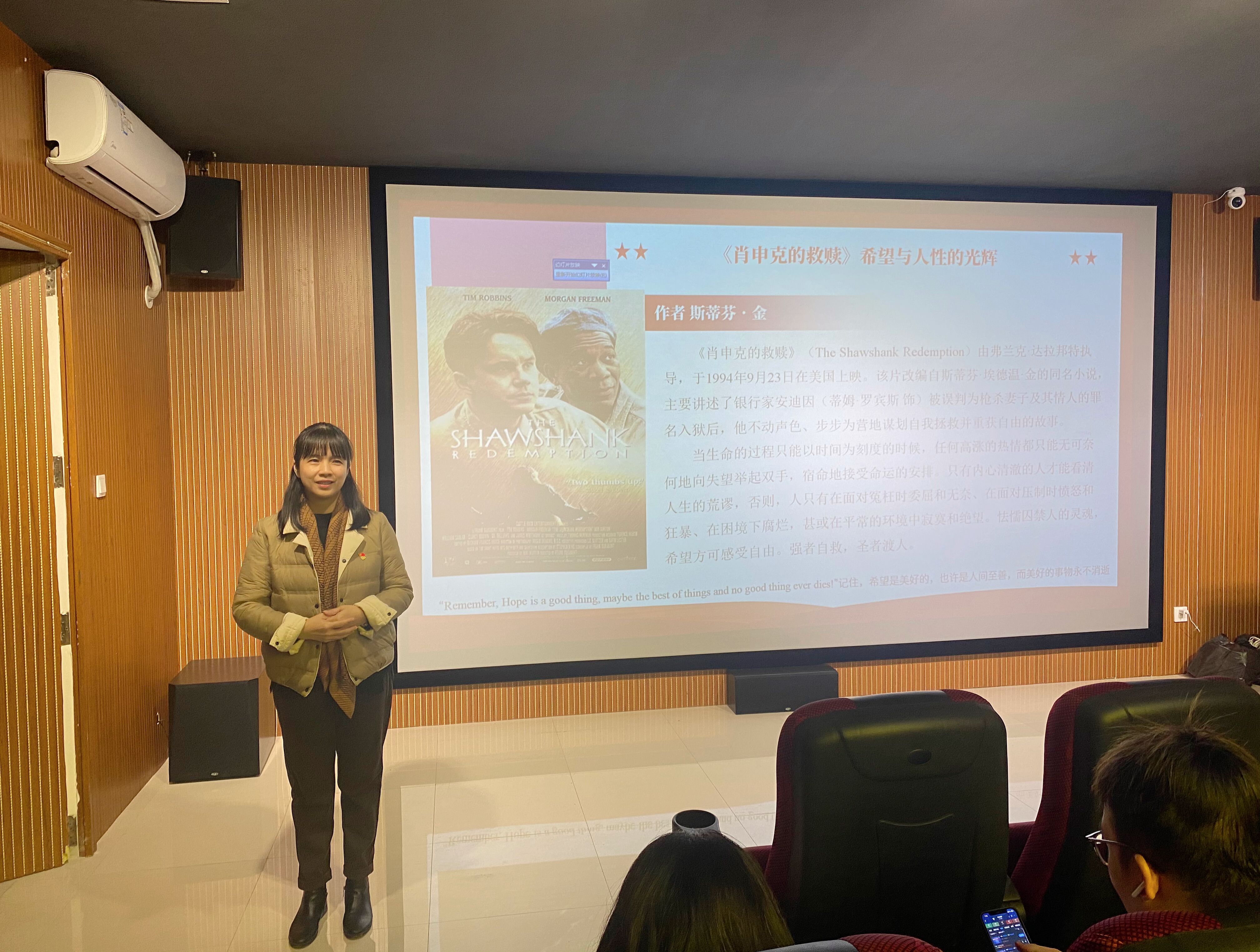[本网讯]为增强学生学习英语的兴趣,丰富校园文化生活,12月5日晚,通识教育学院党支部和英语爱好者协会在里建校区和园一站式思政影厅开展“追梦新时代——校园·英语影院”观影活动。此次观影活动选取了影片《肖申克的救赎》进行观看。近80名学生参加了本次观影活动。