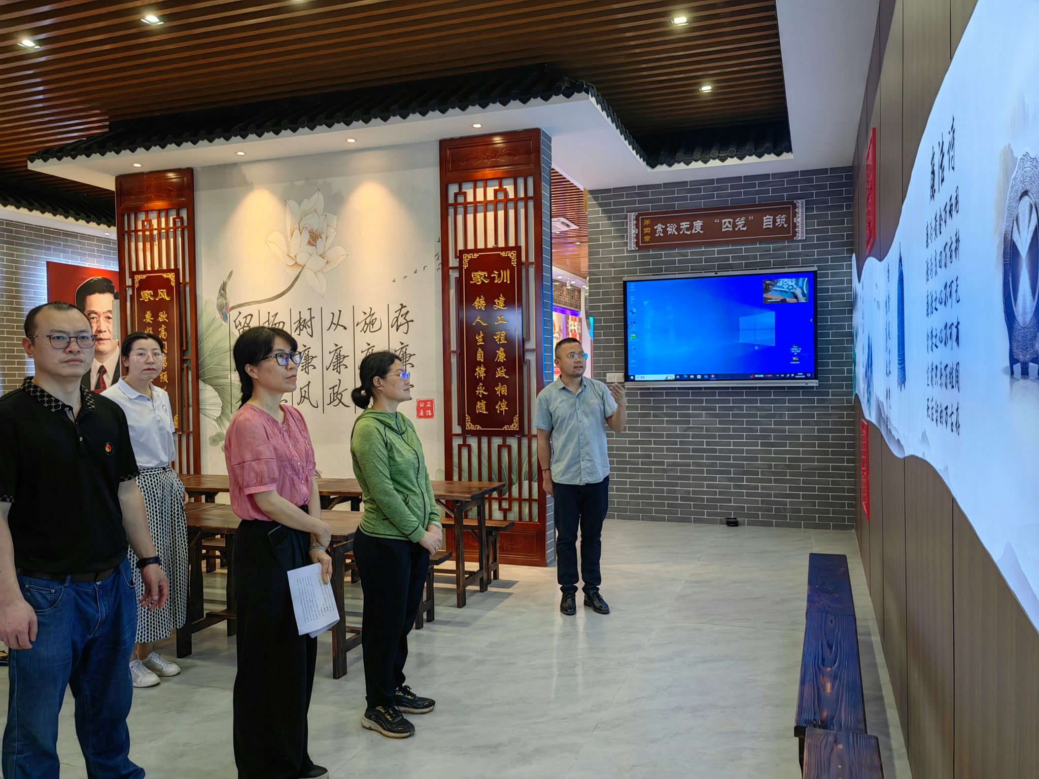 活动伊始,在讲解员的悉心引导下,党员们依次踏入了廉政文化馆的各个展区,深入学习了“全面从严治党,伟大征程;非遗话廉,坚守信仰;竹可载物,廉以育人;贪欲无度,‘囚笼’自筑;回首峥嵘,忆法初心”等七个章节的内容。通过生动而富有深度的展板、多媒体互动及历史文物展示,党员们共同回顾了党在廉洁自律方面的光辉历程和伟大成就,深刻感受到了党在治国理政中始终坚守的严明纪律和崇高信仰。