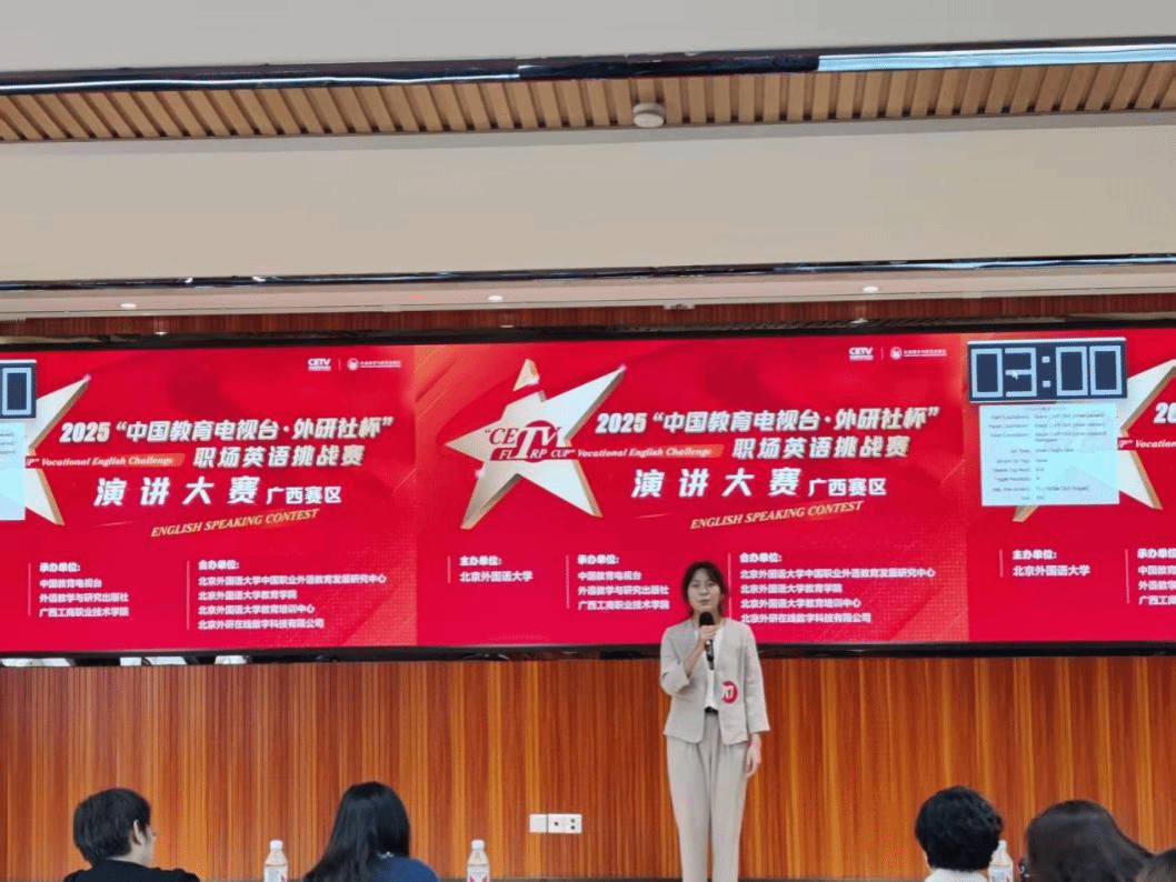 pp电子选手参加2025“中国教育电视台·外研社杯”职场英语挑战赛演讲大赛现场