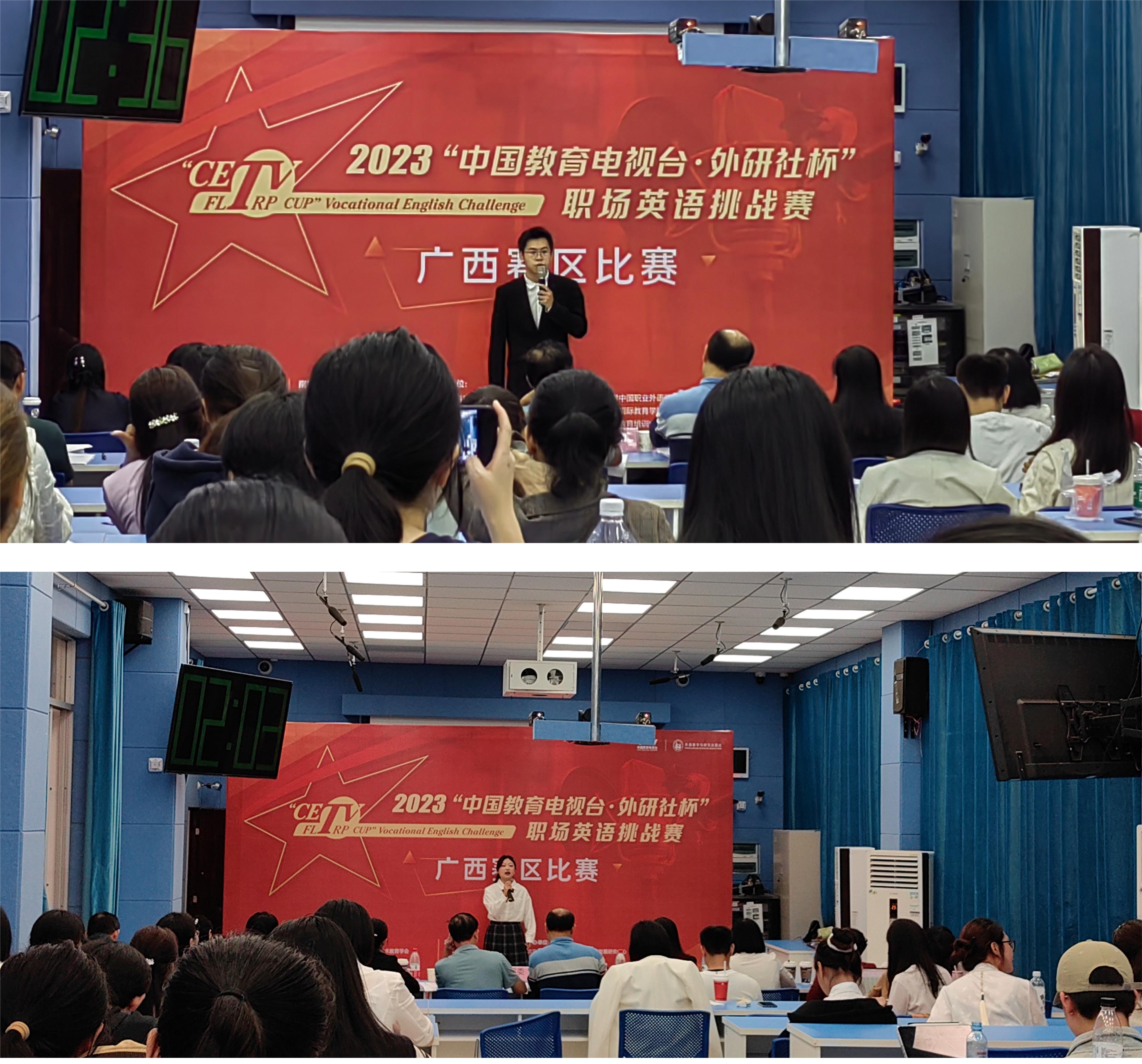 [本网讯]为切实提升学生运用英语讲好中国故事,传播中国文化,进行职场交流的综合能力,2023年10月29日至11月5日,通识教育学院组织pp电子学生参加了由中国职业技术教育学会指导,中国教育电视台、外语教学与研究出版社联合主办的2023年“中国教育电视台▪外研社杯”职场英语挑战赛广西赛区决赛。