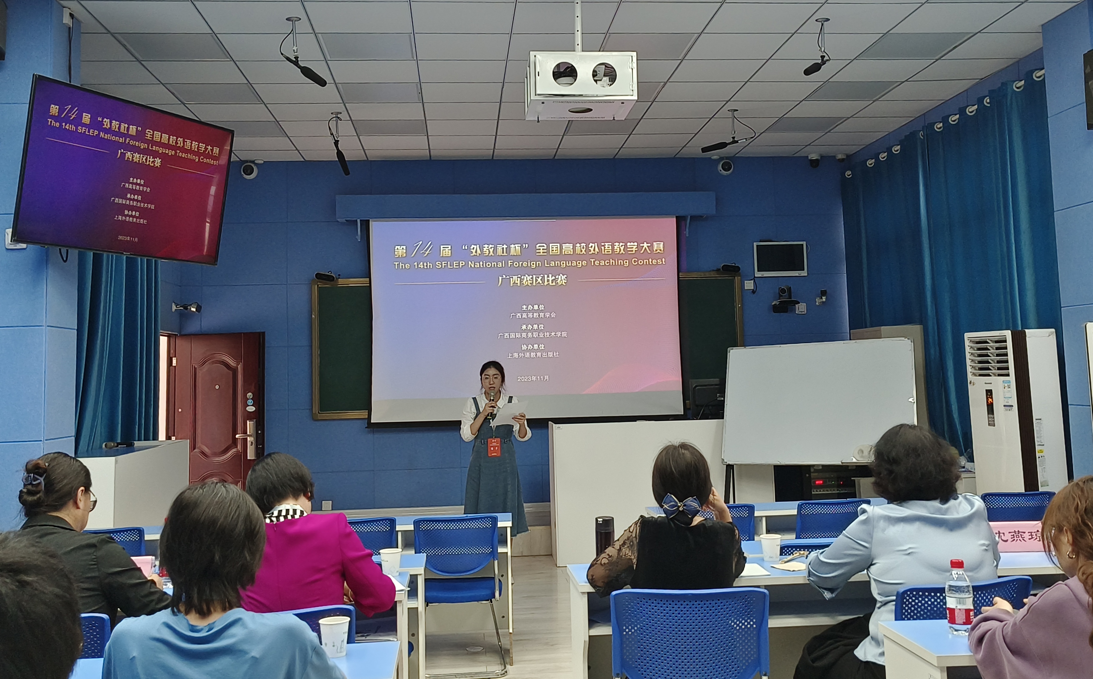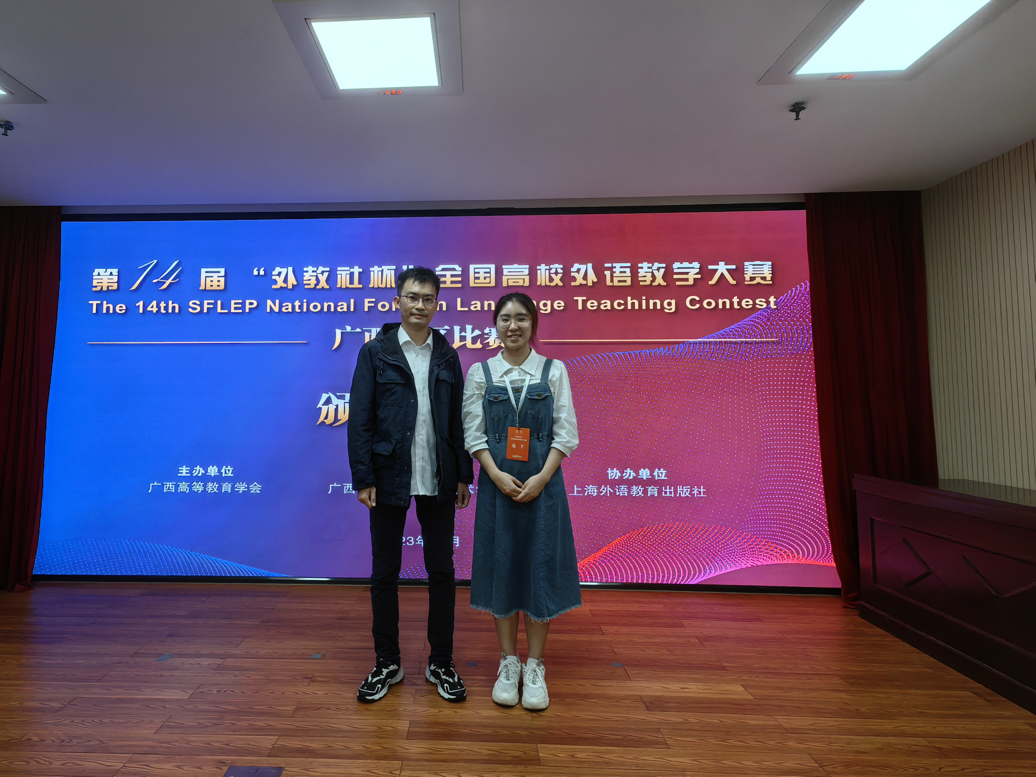[本网讯]11月4日,由广西高等教育学会主办的第14届“外教社杯”全国高校外语教学大赛广西赛区比赛在广西国际商务职业技术学院拉开序幕。pp电子通识教育学院外语教师龚睿韬、王力鹏参加了比赛,参赛团队虚心求教,精心准备,镇定发挥,经过上午复赛以及下午决赛的角逐,pp电子参赛团队最终取得广西赛区第1名的成绩,获特等奖,将代表广西赛区参加12月在上海举行的全国决赛。这是pp电子教师在“外教社杯”全国高校外语教学大赛中获得的最好成绩。