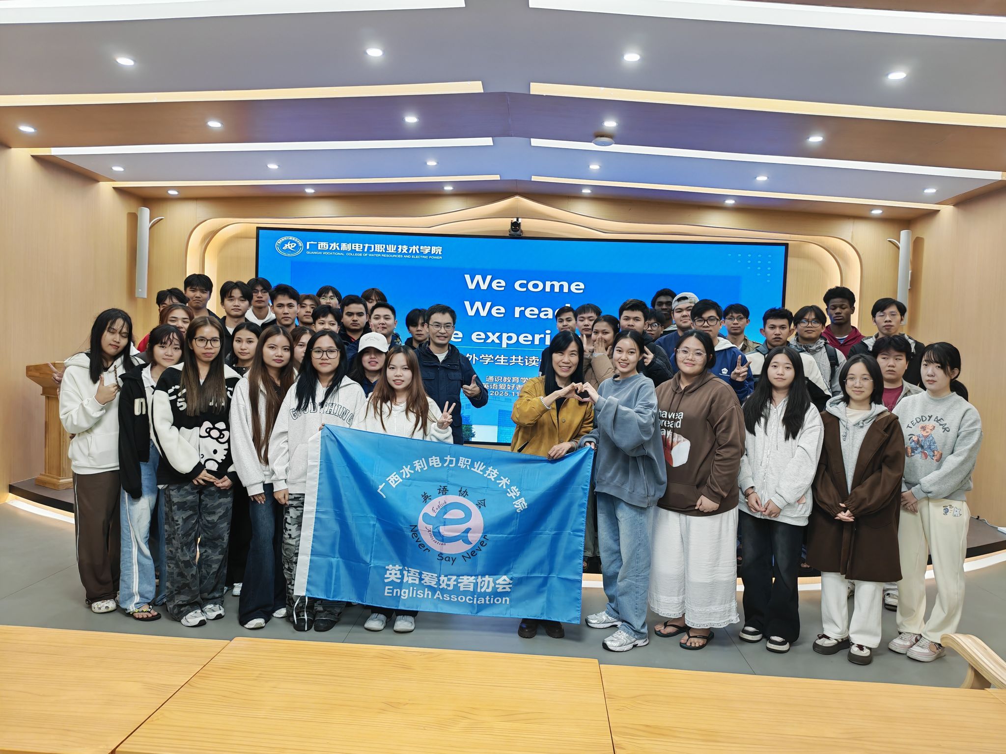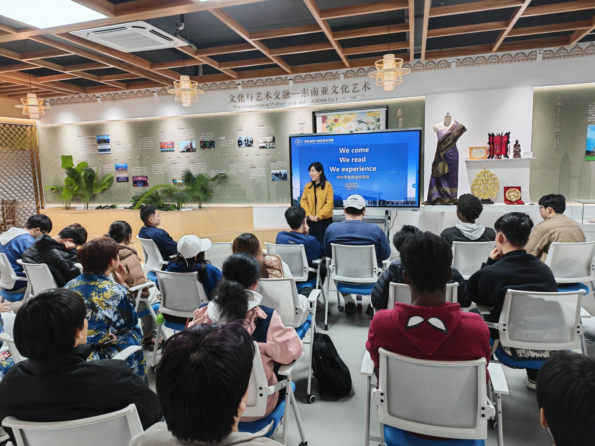 [本网讯]11月18日晚,通识教育学院、英语爱好者协会在里建校区“留学水院”文化交流中心举办以“We come, we read, we experience”为主题的中外学生共读分享会,促进中外学生深度交流。