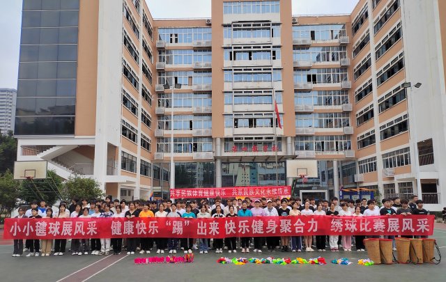 而另一边的背篓抛绣球比赛现场,同学们默契合作,抛绣球的同学瞄准目标,轻甩绣球,使绣球在空中划出一道道美丽的弧线;背篓接球手们更是集中注意力,以半蹲或半跪的姿态配合着绣球抛出的方向斜侧身体,迅速地用背篓接住五彩缤纷的绣球。