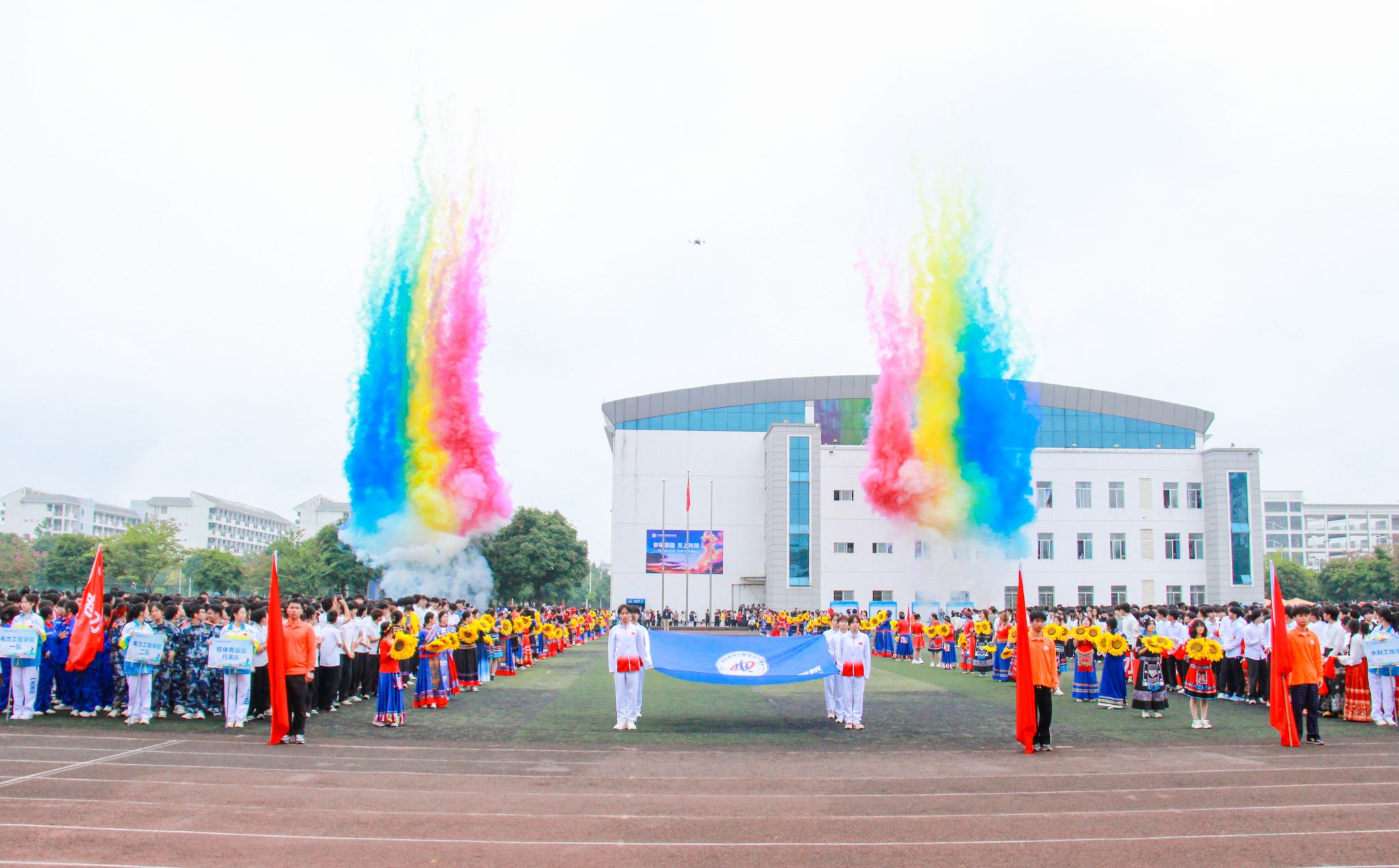 在激昂的乐曲中,国旗队、校旗队、红旗队步伐铿锵,庄严入场;彩旗队与鲜花队精神饱满,神采飞扬,为赛场增添蓬勃朝气。各二级学院、留学生代表队及校体育运动队结合专业特色,围绕“弘扬水电精神”“民族团结”“爱校荣校”等主题,以创意编排和响亮口号依次通过主席台,全面展现水电学子团结进取、奋发向上的青春风采。