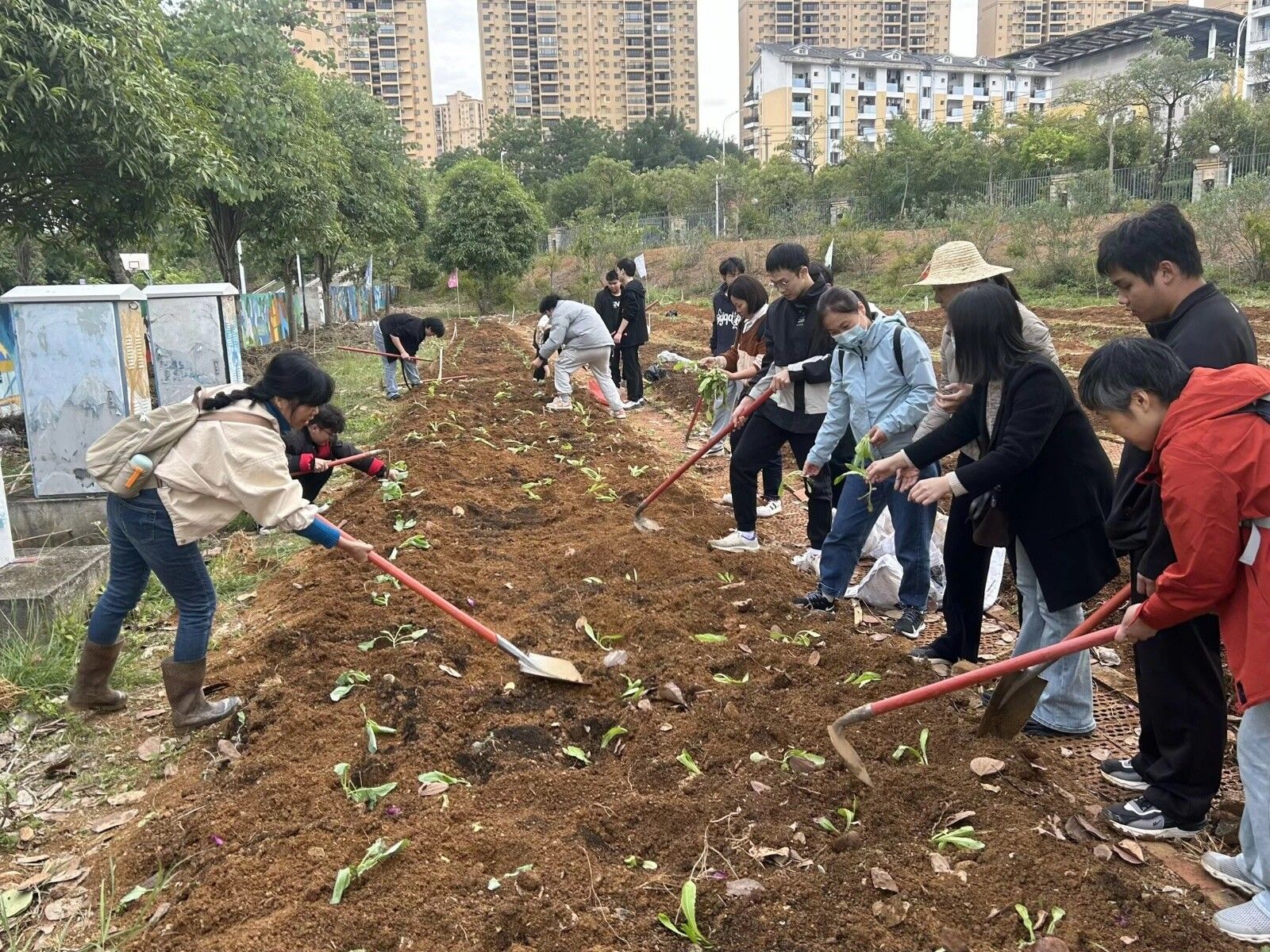 活动以“庆农业丰收,享美好生活”为主题,开锄仪式拉开序幕。通识教育学院院长韦弘在致辞中阐明劳动教育的时代意义,鼓励学生在实践中锤炼品格、增长才干。学院特别邀请农业技术专家黄海生到场,聚焦种植核心,讲解冬季适用的腐熟有机肥用量;示范番茄、包菜播种深度与间距,指导苗木定植时根系舒展要点,为实践提供专业指引。
