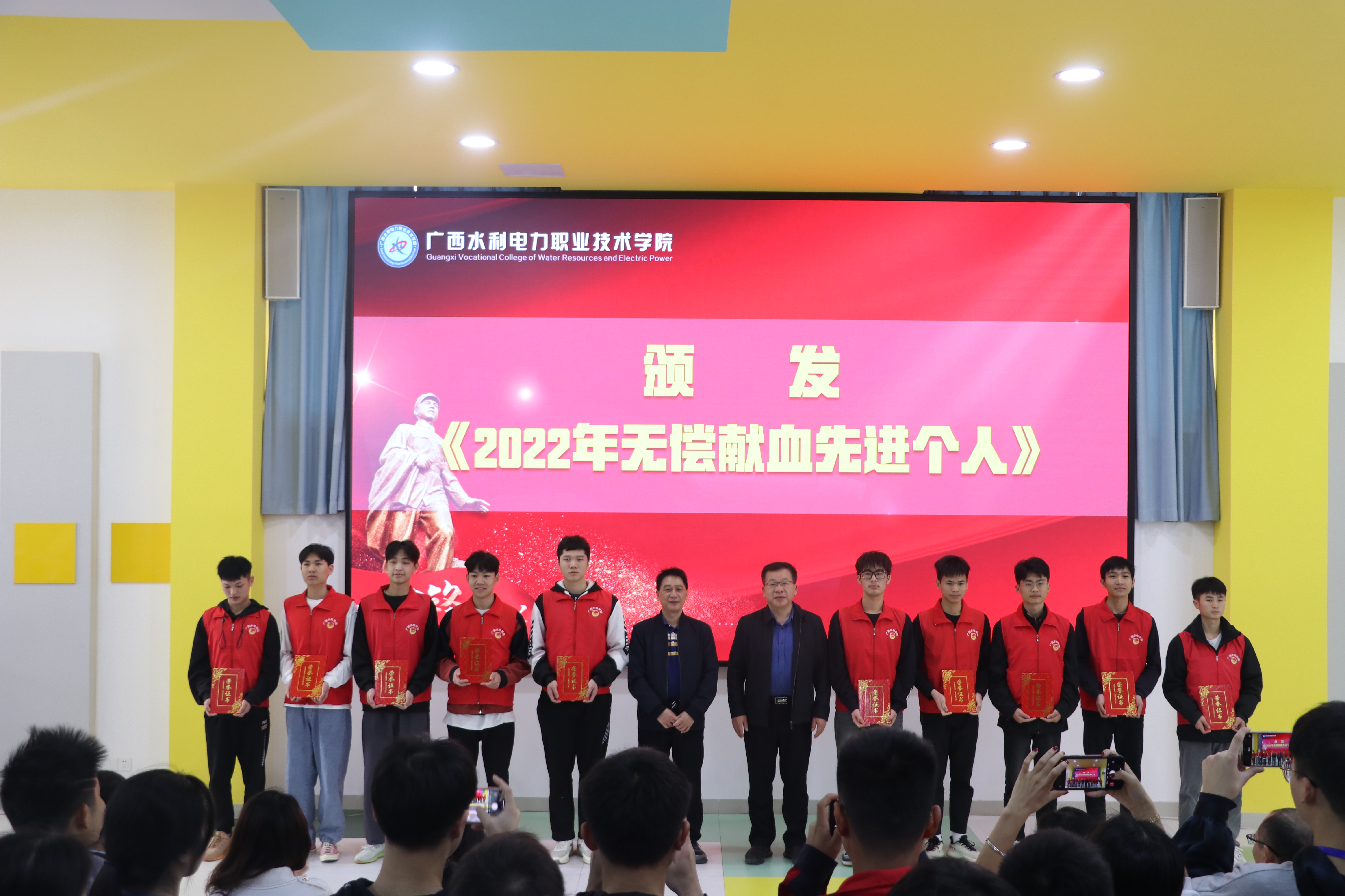 学校校长李林、南宁中心血站党委书记梁立阳为献血先进个人颁奖
