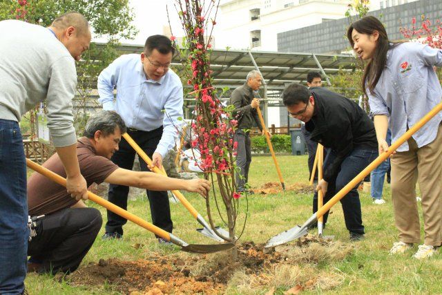 活动现场,师生们一起认真学习了解苗木施肥的方法,了解了如何选择种植地点更利于苗木对化肥的吸收等抚育知识。随后,党员、学生骨干、志愿服务者们进行分组,投入到绿化植树劳动中。大家默契合作、同心协力,扶苗入坑、挥铲填土、提桶浇水,每道植树工序都做得认真细致,个个热情高涨、干劲十足,亲手种下一棵棵树苗,现场呈现出一片热火朝天的劳动景象。经过一个多小时的共同奋战,一排排种好的桃树焕发新生、迎风挺立。植树后,师生们在标识牌上签下名字,与树苗合影纪念,加入到爱绿护绿行动。
