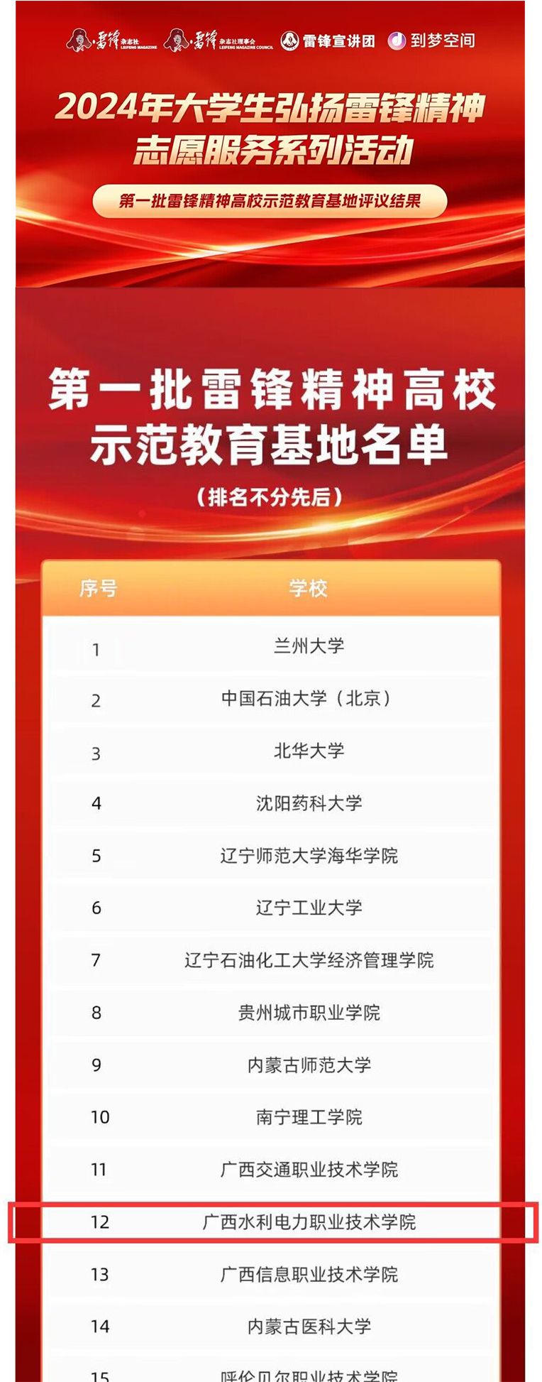 全国第一批雷锋精神高校示范教育基地评议结果