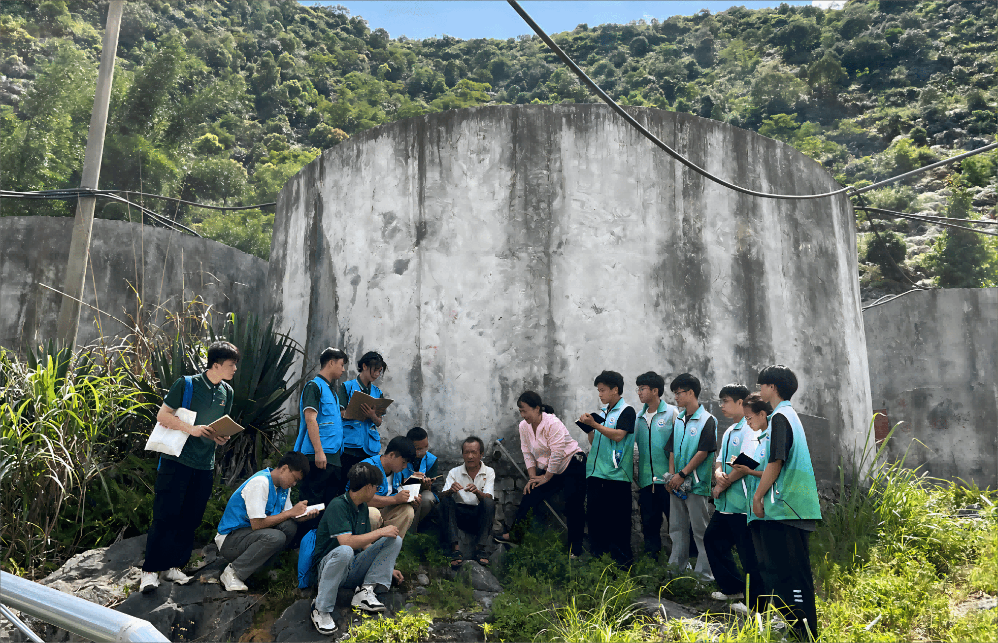实践团跟随pp电子优秀校友共青团大化县委员会副书记陆政来到大化瑶族自治县江南乡上和村娅景屯水柜群所在地,他向实践团成员详细阐述了水柜群项目对于提升当地居民生活质量的重要性,以及这一民生工程如何在党的领导下,通过政策支持和居民的共同努力,实现了从贫困到自立的转变。实践团成员来到水柜群旁边,聆听上和村老支书蓝剑才生动地讲述了当地居民如何从“一水三用贵如油,洗菜洗脚又喂牛”的用水困难,到百姓喝水不再望“天”的幸福生活。