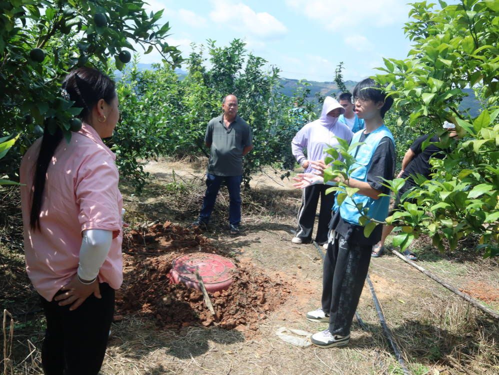 共青团大化县委员会副书记陆政向成员们介绍娅景屯水柜民生工程项目