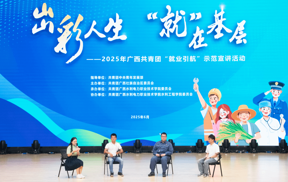 2025年广西共青团“就业引航”示范宣讲活动以“出彩人生,‘就’在基层”为主题,活动邀请了三位在基层就业创业的优秀校友,分享他们在基层的奋斗故事与成长感悟,引导青年学子投身基层一线,书写奋斗青春。