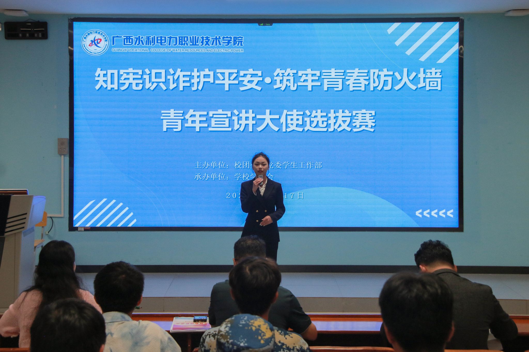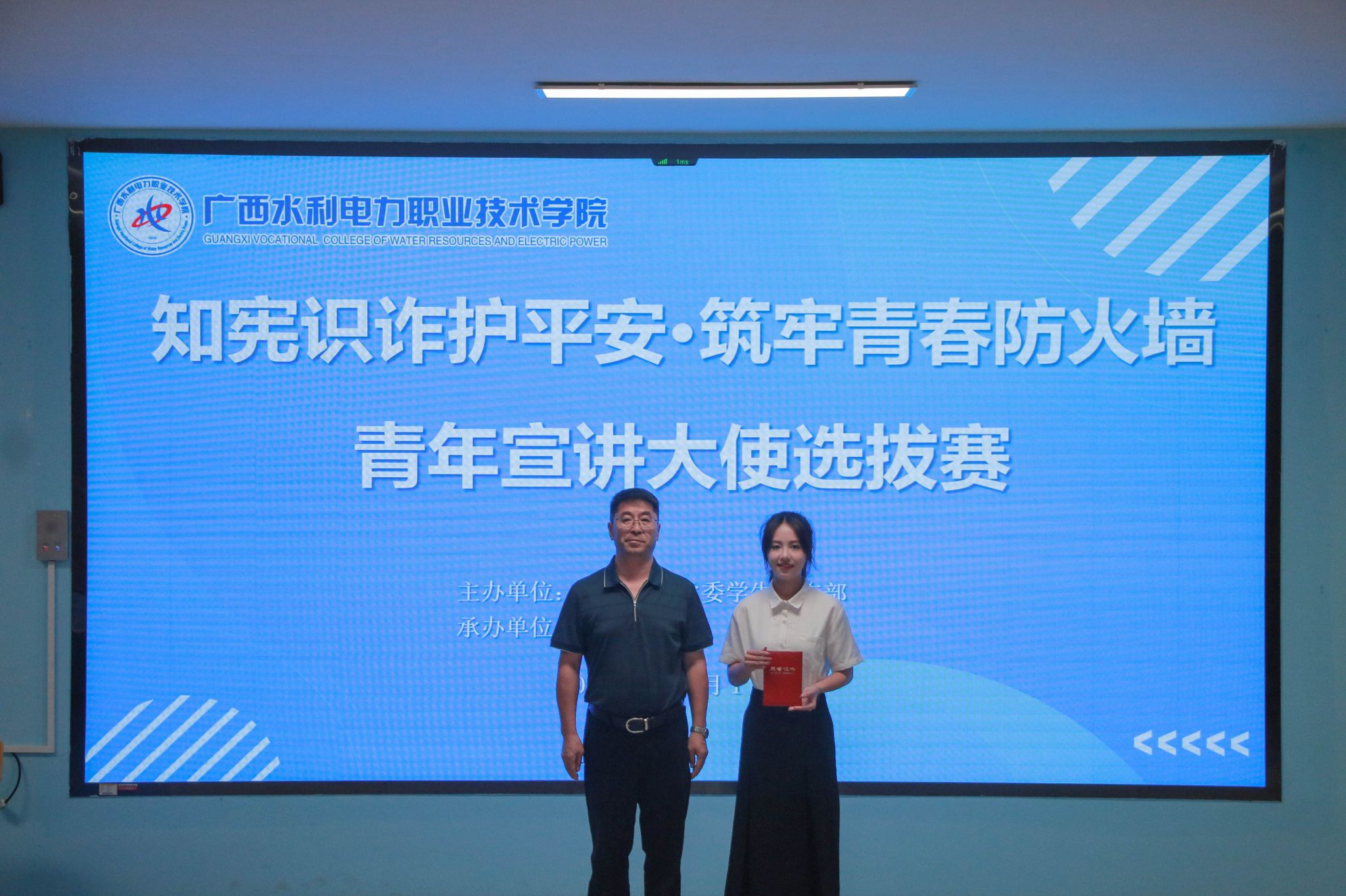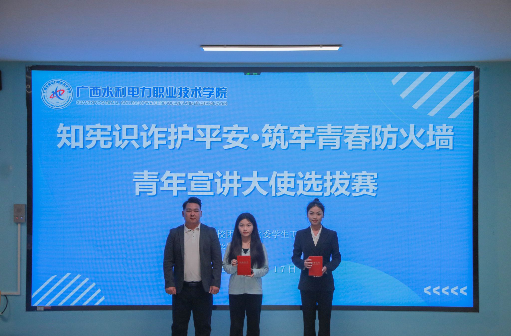 [本网讯]为深入学习宣传宪法知识,提升大学生防范电信网络诈骗的意识和能力,响应上级团组织号召,2025年11月17日晚,pp电子“知宪识诈护平安·筑牢青春防火墙”青年宣讲员选拔赛在里建校区教学楼阶梯101教室圆满落幕。本次比赛由校团委主办,旨在选拔一名优秀学生代表,代表学校参加武鸣区级宣讲活动。经过激烈角逐,来自电力工程学院的覃玮琦同学凭借出色表现荣获一等奖,并将作为学校代表推荐参赛。