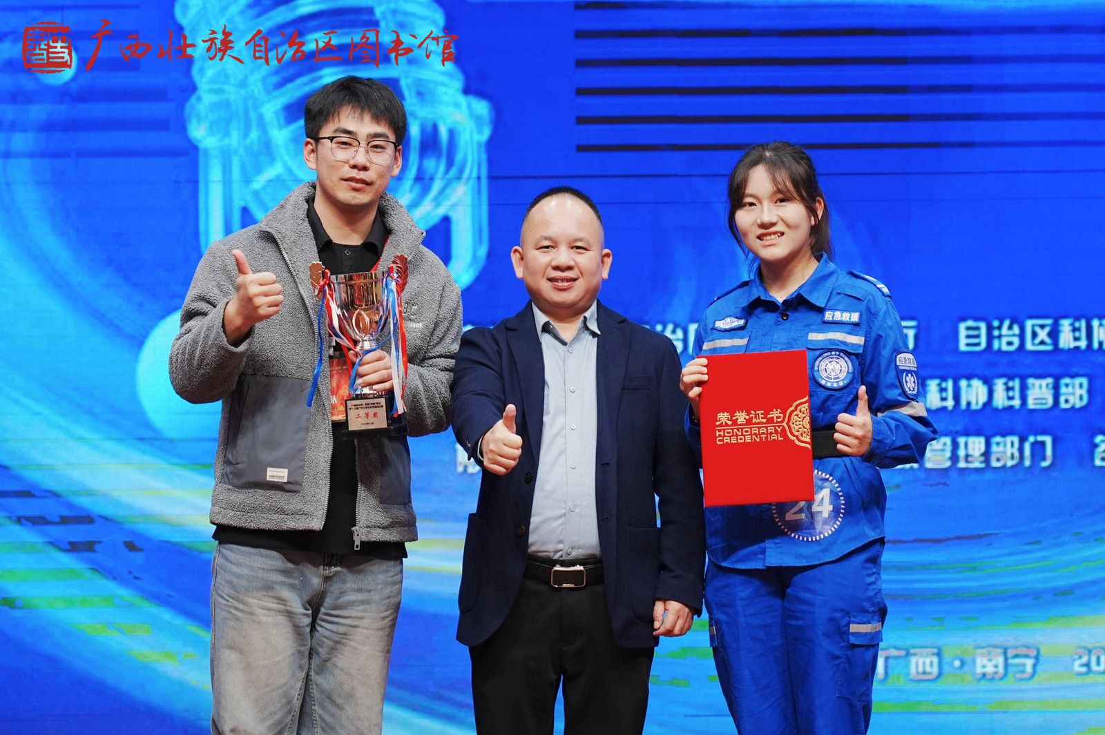 共青团广西区委学校部部长李畅宝与获奖学生及指导老师合影