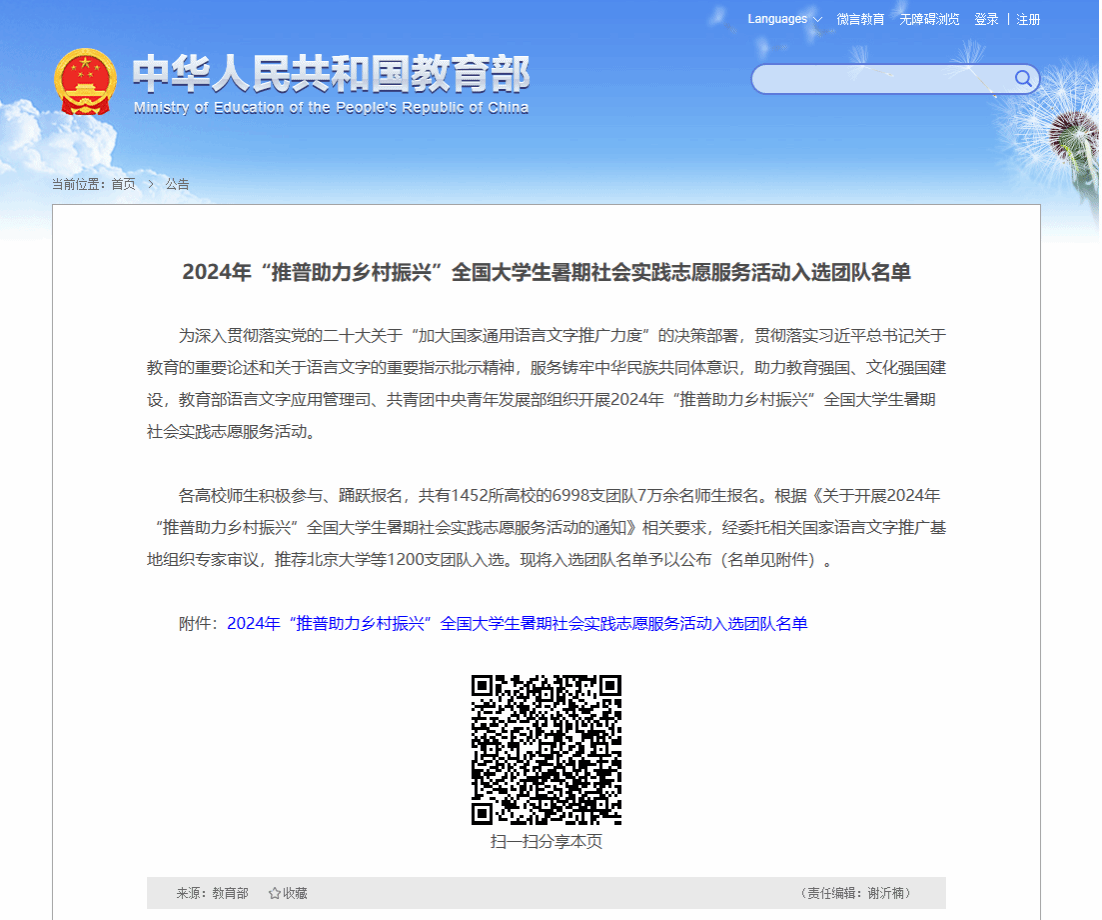 近日,教育部公布《2024年“推普助力乡村振兴”全国大学生暑期社会实践志愿服务活动入选团队名单》,全国各高校师生积极参与、踊跃报名,共有1452所高校的6998支团队7万余名师生报名,经过遴选与专家审议,最终有1200支团队入选,其中,广西壮族自治区共有24所高校的44支团队入选。pp电子“瑶音‘普’亮,水润‘乡’兴”大禹青年实践团成功入选2024年“推普助力乡村振兴”全国大学生暑期社会实践志愿服务活动。
