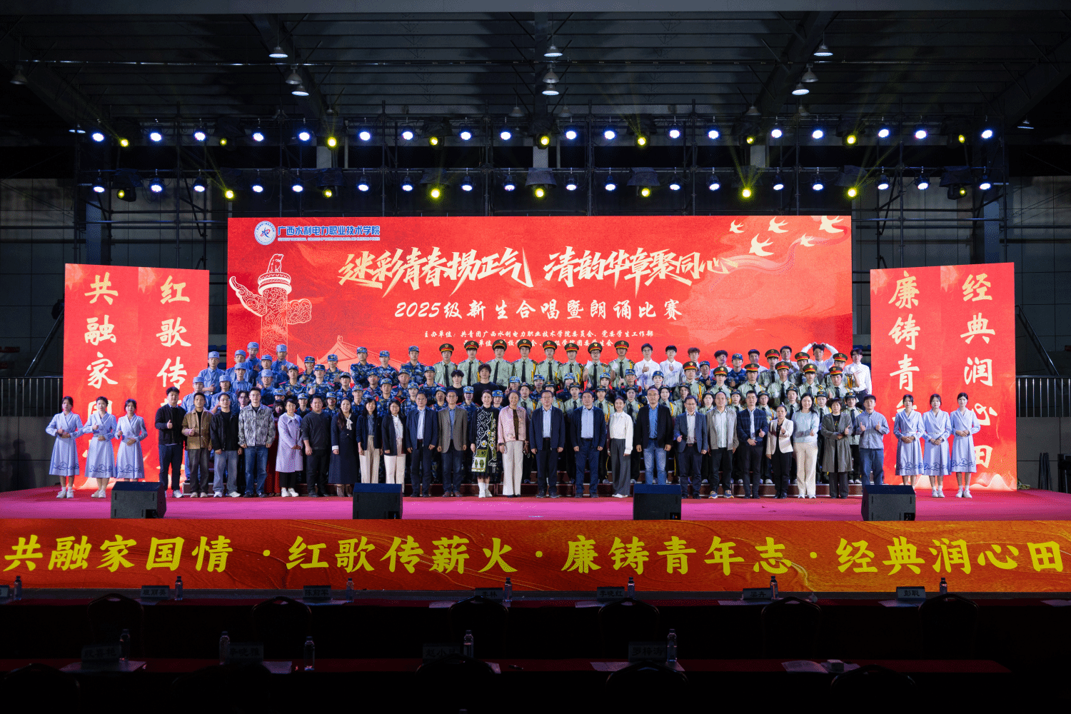 本次比赛不仅是一场艺术竞技,更是一堂生动深刻的“大思政课”。它成功地将国防教育、廉洁教育与民族团结教育深度融合,激励全体2025级新生以更加昂扬的姿态开启大学生涯,为学校高质量发展贡献青春力量。