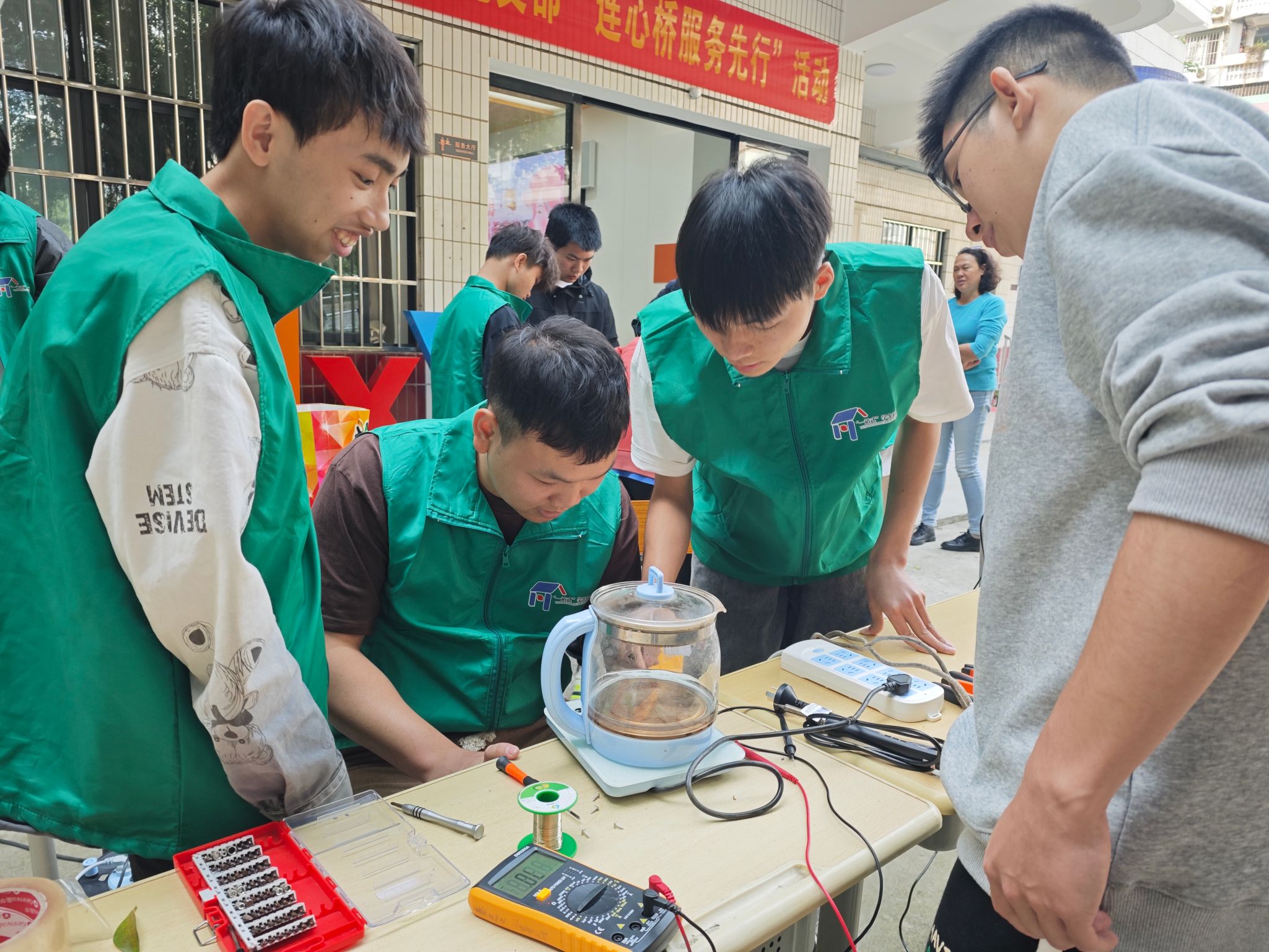 信息工程学院学生党支部根据广西教育科学“十四五”规划学校党的建设项目统筹开展“一站式”学生社区与“六同六力”党建工作品牌共融共建实践探索,探寻两者结合的品牌模式。在本次活动中,电子信息专业的入党积极分子和团员青年们发挥专业优势,给师生维修家电、宣传和普及基本用电知识,以实际行动响应“我为群众办实事”的号召,得到师生的一致认可。