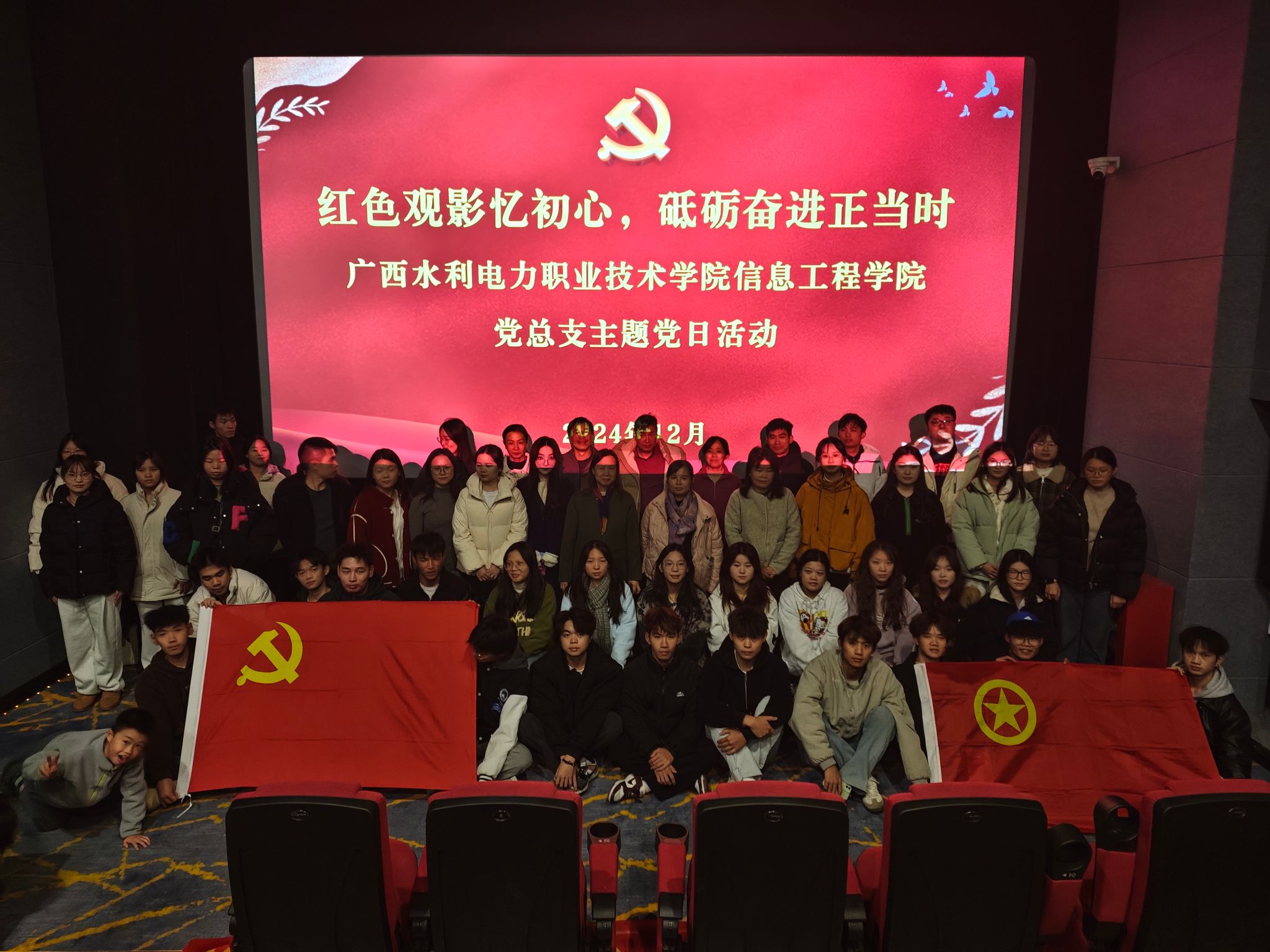 [本网讯]12月16日,信息工程学院党总支组织学院教职工与40余名学生预备党员及入党积极分子前往广西实验电影院,开展“红色观影忆初心,砥砺奋进正当时”主题党日活动,观看红色电影《大突围》。信息工程学院党总支书记张志秀、学院院长宁爱民参加活动,与师生们一同参与了本次富有教育意义的观影之旅。