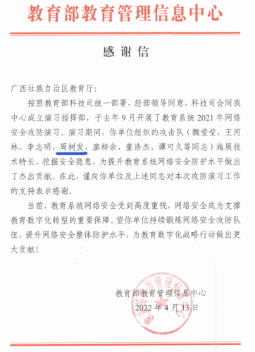 众多优秀毕业生凭借扎实的专业知识和突出的综合素质,在升学与就业道路上成绩优异。其中,周树发同学在校期间荣获广西职业院校技能大赛《信息安全管理与评估》一等奖(广西第一),升本期间在全国教育护网行动中表现突出,荣获全国第三名,并多次获得教育部、广西教育厅、广西军区的发函致谢,同时顺利考上广西科技大学研究生。