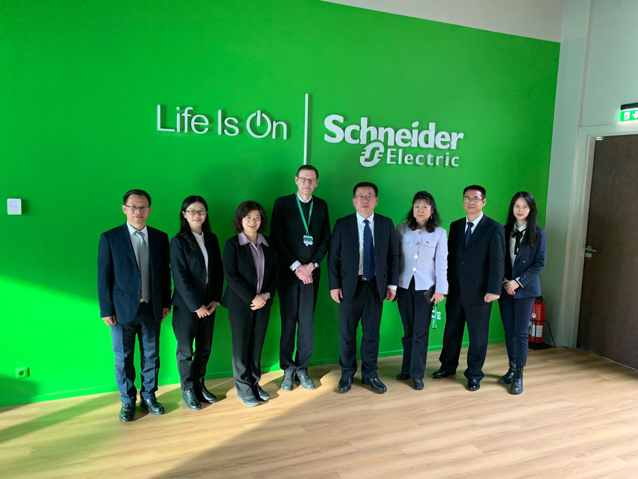 At Schneider Electric in France, the delegation visited Schneider Electric's Global Marketing Director Zhang Danhui and Vocational Education Supervisor Mr. Minet, toured the Schneider Electric Innovation Center, and learned about Schneider's advanced practices in leading digital transformation and sustainable development in global energy management and automation. Both parties held a symposium on further exchanges. President Li Lin introduced the construction progress of the green and low-carbon industry-education integration project with Schneider Electric at the college, noting its great significance and the ability to leverage Schneider's technological leadership and the college's professional educational advantages. Schneider Electric gave full affirmation to the construction progress of the green and low-carbon industry-education integration project at the college and expressed its willingness to further cooperate.