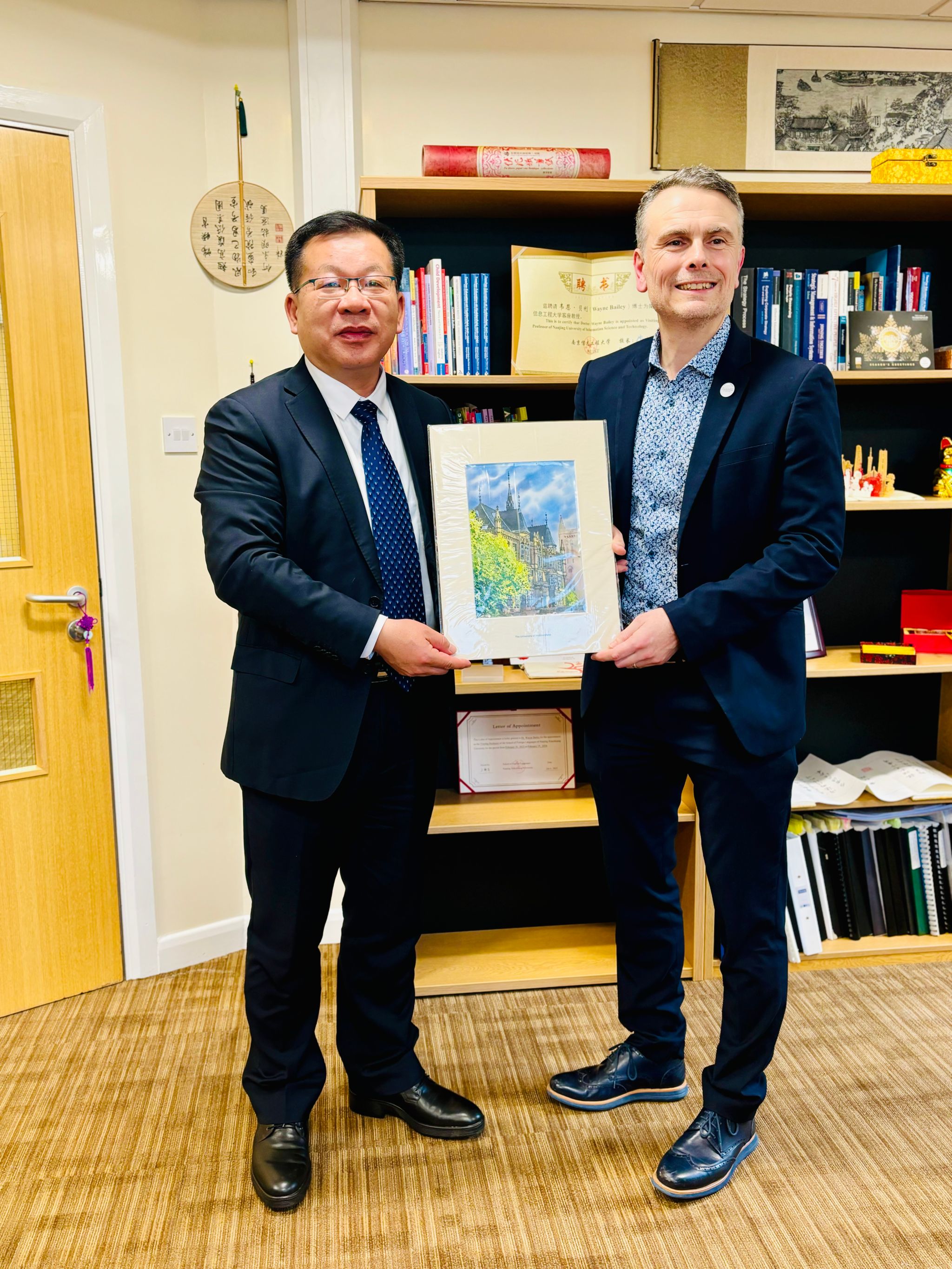 Dr. Wayne Bayley of University of Huddersfield presents souvenir to President Li Lin