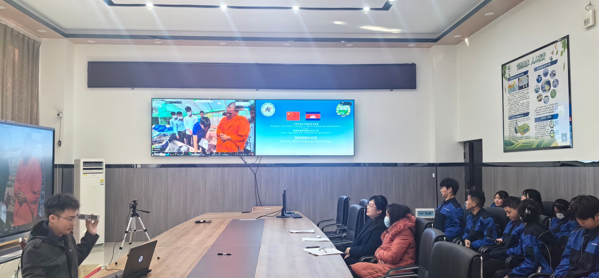 On the morning of December 21, 2023, Guangxi Vocational College of Water Resources and Electric Power and  Prek Leap National Institute of Agriculture jointly organized a "Virtual Skills Competition" focused on the installation and operation of irrigation units. Attendees included Director Li Changni of the Foreign Exchange Center, Dean Yu Jinfeng of the School of Hydraulic Engineering, Dr. Sovatna Phon, Dean of the Faculty of Science, Technology, and Agricultural Engineering at Prek Leap National Institute of Agriculture, and Mr. Samon Tith from the Planning and International Relations Office. Over 100 teachers and students from both institutions participated in the event through a combination of online and offline methods.