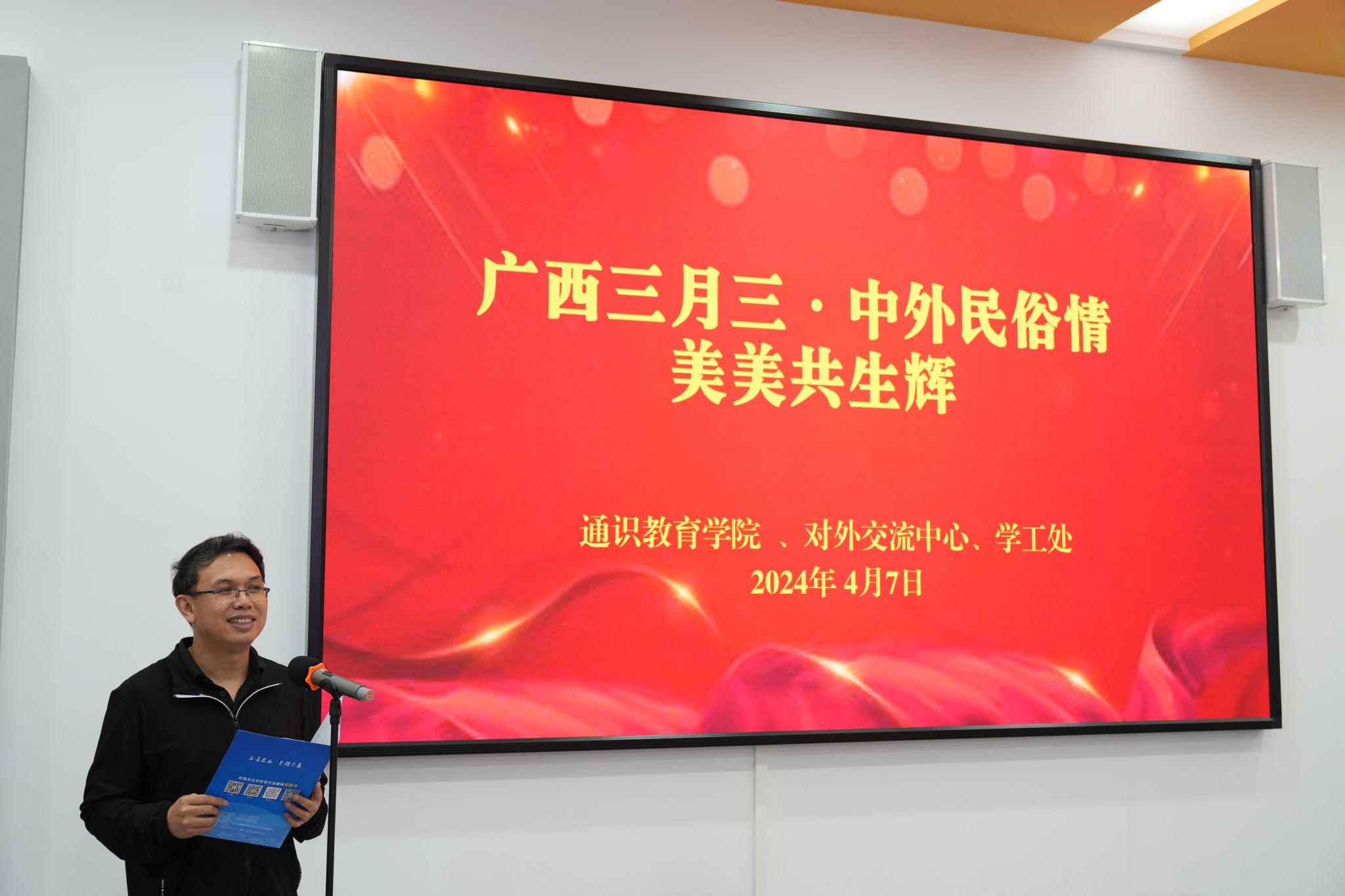 In order to promote Chinese culture, deepen the sense of identity and pride in Chinese culture among our students, enrich campus cultural life, and enhance the cultural literacy of teachers and students, the General Education School, in collaboration with the Foreign Exchange Center and the Student Affairs Office, organized a "Guangxi Sanyue San: A Celebration of Chinese and Foreign Folk Cultures, Highlighting the Beauty of Diversity" folk culture experience event on the afternoon of April 7, 2024, at the "One-Stop" Student Community of our school's Changgang campus. Deputy President Liu Cunxiang, as well as key officials from the Student Affairs Office, Foreign Exchange Center, and General Education School, teacher representatives, student representatives, and nearly 60 international students participated in this event.