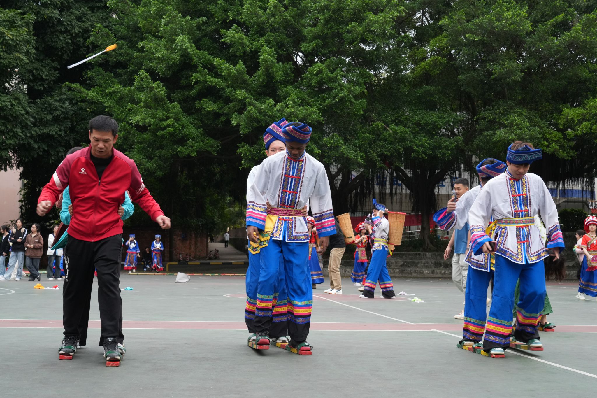 Subsequently, a series of colorful folk culture experience activities were carried out, including "Folk Culture Science Popularization Experience," "Ethnic Food Appreciation," and "Folk Sports Experience." After learning about the historical origins and cultural connotations of "Sanyue San," Chinese and foreign teachers and students tasted the Zhuang ethnic cuisine "Five-Colored Sticky Rice" and danced to ethnic music. International students were deeply attracted by the Zhuang ethnic cuisine, costumes, and sports activities, immersing themselves in the experience. In a relaxed and joyful atmosphere, they participated in unique ethnic sports such as basketball-tossing with a embroiderred ball, shuttlecock kicking, bamboo pole dancing, and three-person wooden shoes walking. Amidst laughter and joy, they enhanced their understanding of traditional Chinese culture and experienced the unique charm of Guangxi culture, which embodies the principle of "appreciating the beauty in each culture and fostering harmony among diverse beauties."