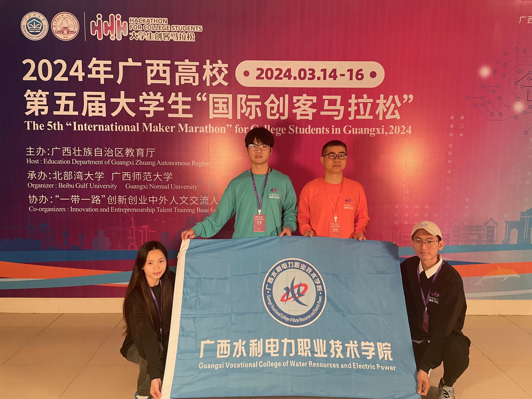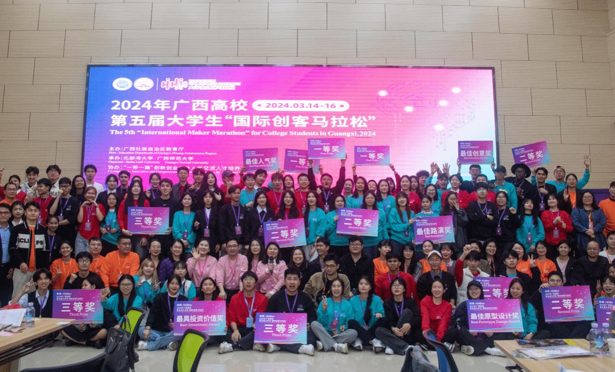 To promote cultural exchanges among countries participating in the Belt and Road Initiative, deepen mutual understanding and trust among young people from various nations, enhance the sense of innovation and practical ability of college students, and showcase innovative and practical achievements, the Education Department of Guangxi Zhuang Autonomous Region, in collaboration with Beibu Gulf University and Guangxi Normal University, organized the 5th Guangxi Universities Student "International Maker Marathon" in 2024. The event was held from March 15th to 16th at the Innovation and Entrepreneurship Institute Roadshow Hall of Beibu Gulf University, attracting 161 international faculty and students from 15 teams and 61 universities across the region. Representatives from our university, including both domestic students and international students, formed a team to participate.