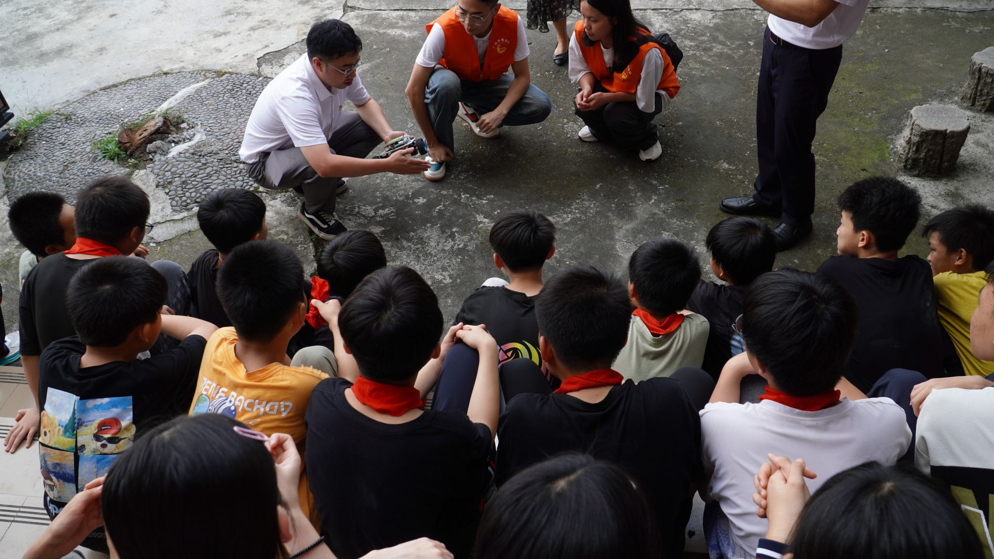 在活动现场,小朋友们表现出浓厚的兴趣,纷纷围观询问,学院师生们耐心解答,演示了小车的操控方式和学生自制的音响设备,现场互动频繁,氛围热烈而融洽。