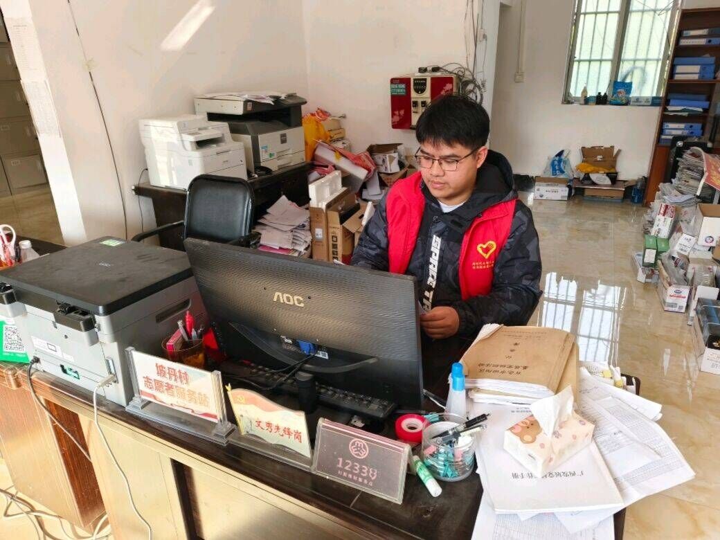熊奕捷在博白县新田镇社门村民委员会进行整理文件工作