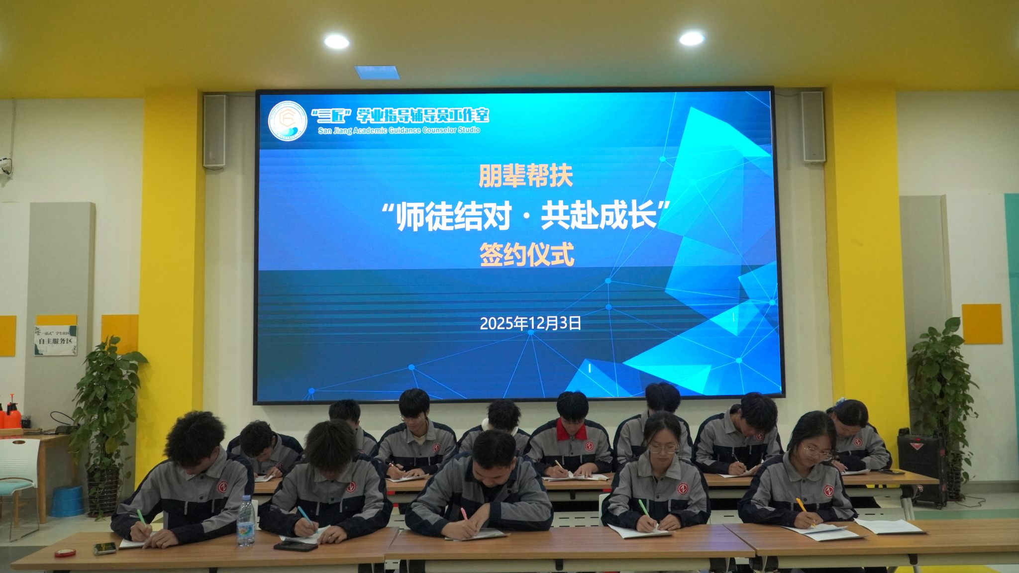 随后的师徒结对签约仪式充满仪式感。经前期筛选匹配,四组帮扶小组的成员代表登台。大三的“师傅”与大一“徒弟”分别完成自我介绍、签署帮扶协议,并集体宣读协议内容,郑重确立帮扶关系。签约仪式后,各组师徒立即开展了首次深度交流,部分小组还现场拟定了月度帮扶计划,明确了定期沟通机制。
