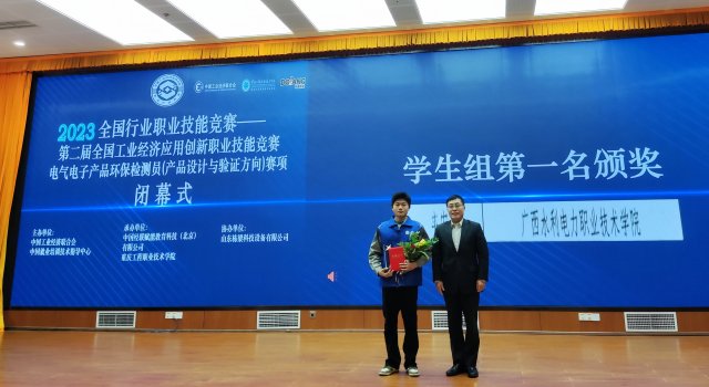 [本网讯]12月5日,2023年全国行业职业技能竞赛——第二届全国工业经济应用创新职业技能竞赛全国总决赛《电气电子产品环保检测员》(产品设计与验证方向)赛项在重庆工程职业技术学院落幕。由自动化工程学院郭平、杨振华老师指导22级电气自动化技术3班学生韦宏不畏困难、奋勇拼搏,在全国23位参赛队员中脱颖而出,以学生组第1名的优异成绩,斩获该项赛事全国一等奖。