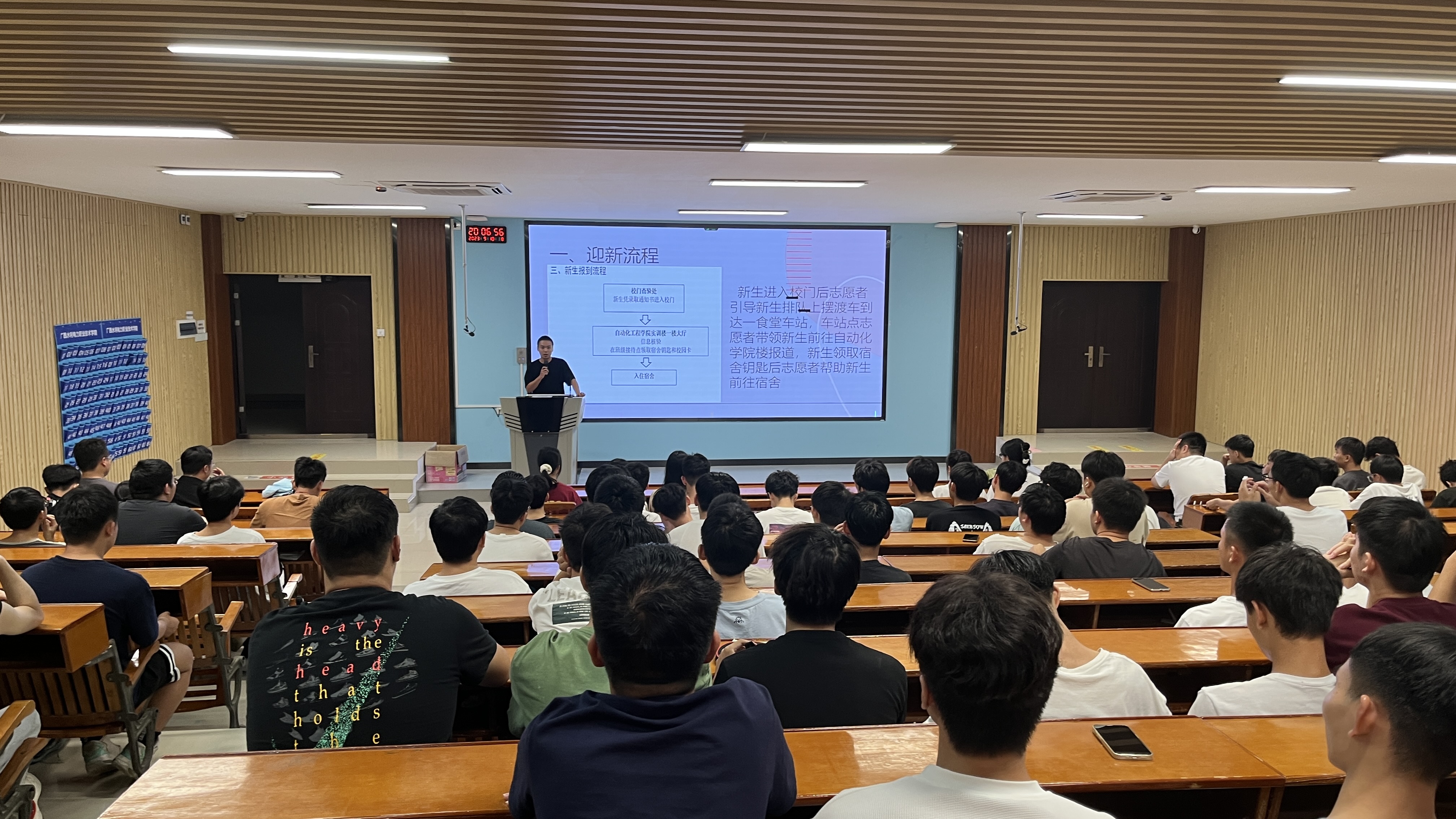 林老师给同学们介绍了关于新生接待的流程和志愿服务工作的内容,他强调了志愿者服务工作的重要性,围绕着“热情、周到、文明、有序、安全、高效”的工作目标,要求同学们在迎新工作中要做到遵守纪律、注意形象、言行文明、热情周到、安全高效,积极配合学院老师做好各项接待工作。