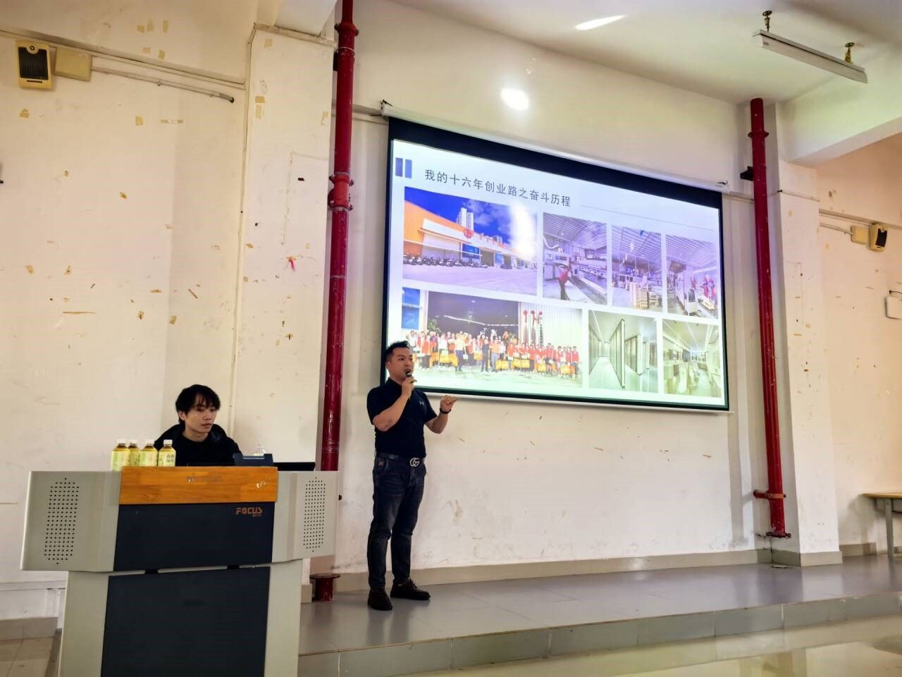 吴启鹏深耕行业十六载,凭借扎实的专业功底与敢闯敢拼的创业精神,创办了广西精邸整装工厂、喜米达全屋定制工厂等多家企业,现任南宁荔浦商会常务副会长。讲座中,他回顾三年校园学习经历,与在座师生分享从职场起步到跨界创业的奋斗历程,并向学子们提出三点成长建议:一是职场初期重深度,深耕领域练专长,“一专是立身之本”;二是努力为选择奠基,先把眼前事做极致;三是诚信为无形资产,需格外珍视。