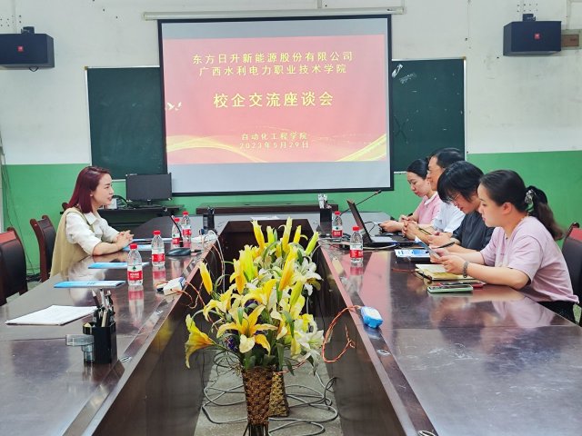 石庆华书记对企业领导的到访表示热烈的欢迎,他介绍了校院办学情况及当前学院的就业形势,希望与企业加强合作,推动产教融合、学生就业等工作的开展。东方日升新能源股份有限公司人事经理蒋兰介绍了企业的基本情况、岗位信息、薪酬福利等方面的内容,她表示希望校企双方加强合作,实现共赢。
